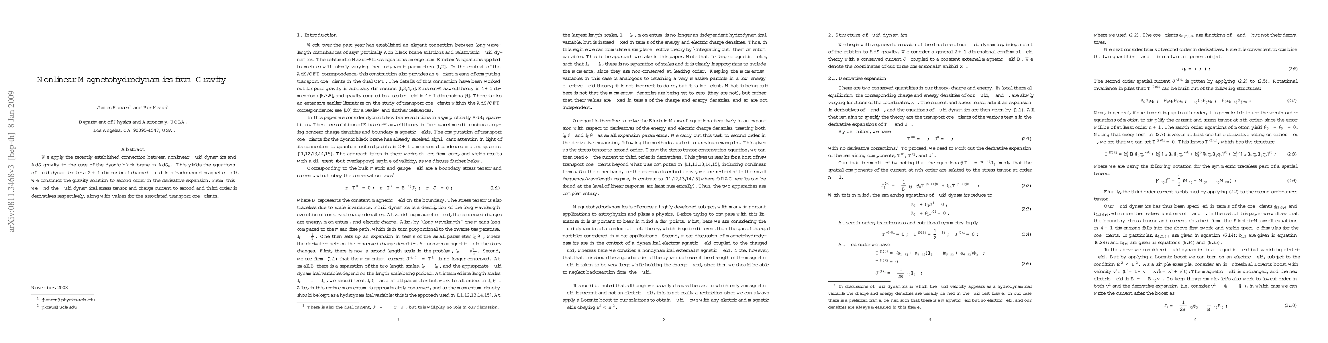 This paper connects nonlinear fluid dynamics to AdS gravity, deriving fluid dynamics equations for a 2+1 dimensional charged fluid in a magnetic field from a dyonic black brane in AdS_4, and calculates the stress tensor, charge current, and transport coefficients to second and third orders in derivatives.