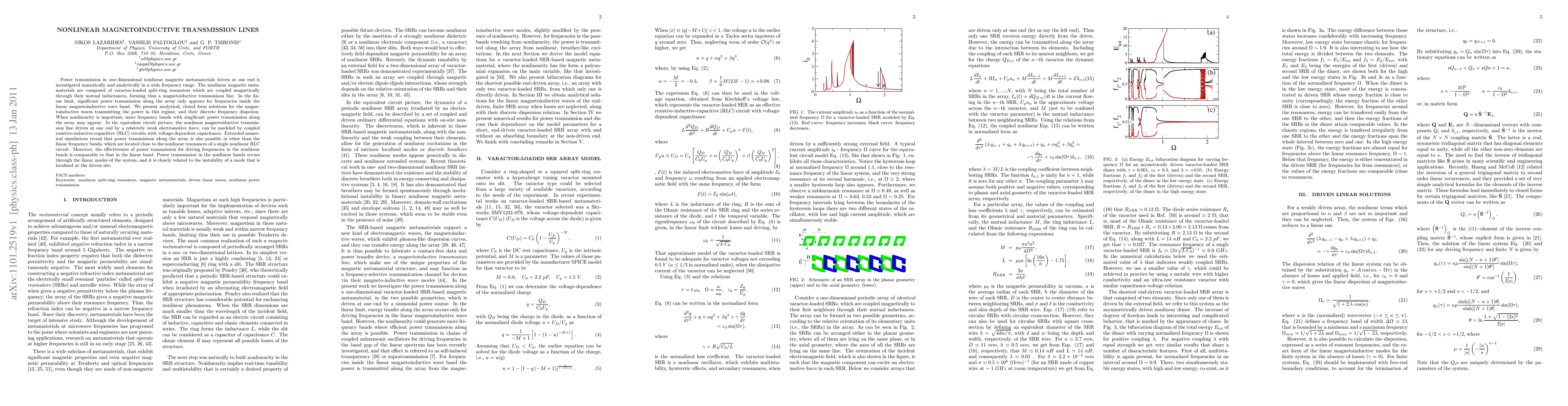 This paper investigates nonlinear magnetoinductive transmission lines composed of varactor-loaded split-ring resonators, revealing significant power transmission in both linear and nonlinear frequency bands. Analytical solutions and numerical simulations show that power transmission can occur near nonlinear resonances, with effectiveness comparable to linear bands.