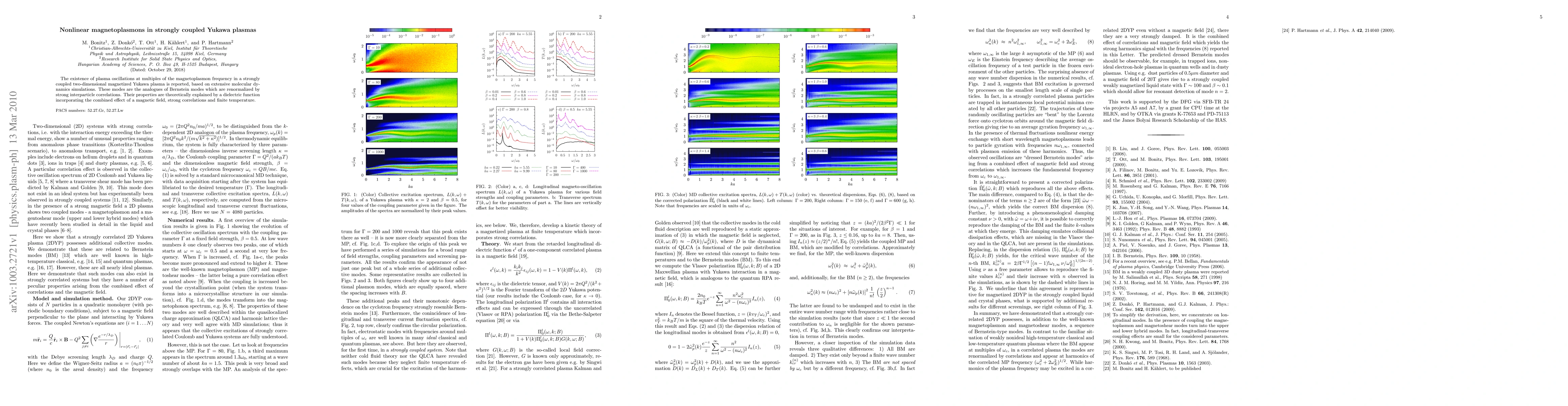 Summary: Molecular dynamics simulations reveal nonlinear magnetoplasmons in strongly coupled two-dimensional Yukawa plasmas, analogous to renormalized Bernstein modes, explained by a dielectric function considering magnetic field, strong correlations, and finite temperature effects.