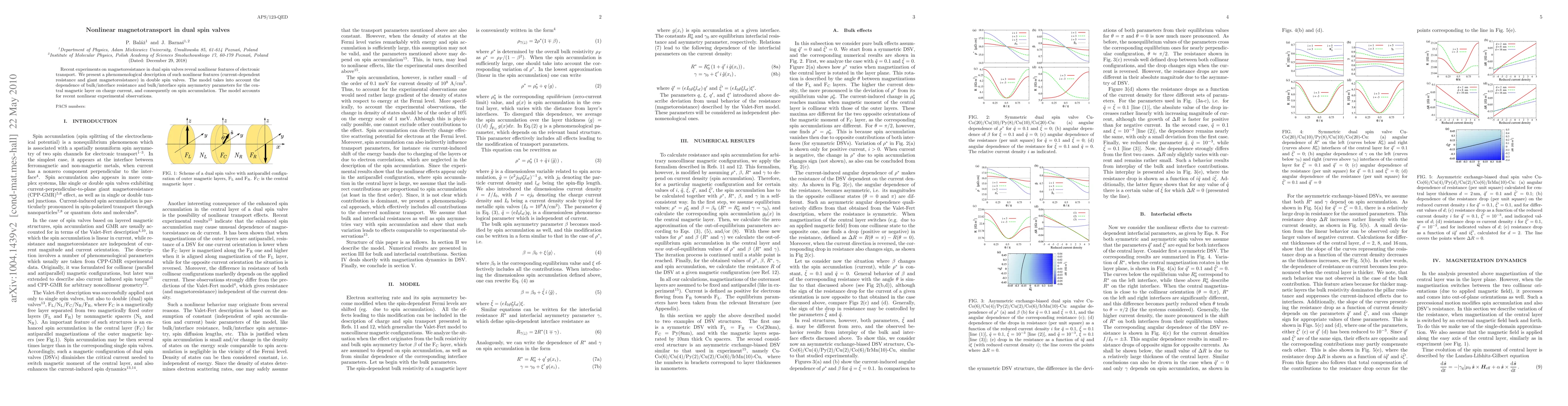 The paper proposes a phenomenological model to explain nonlinear magnetoresistance in dual spin valves, observed in recent experiments. This model modifies the Valet-Fert approach, considering current-dependent bulk/interface resistance and spin asymmetry parameters, accurately accounting for these new findings.