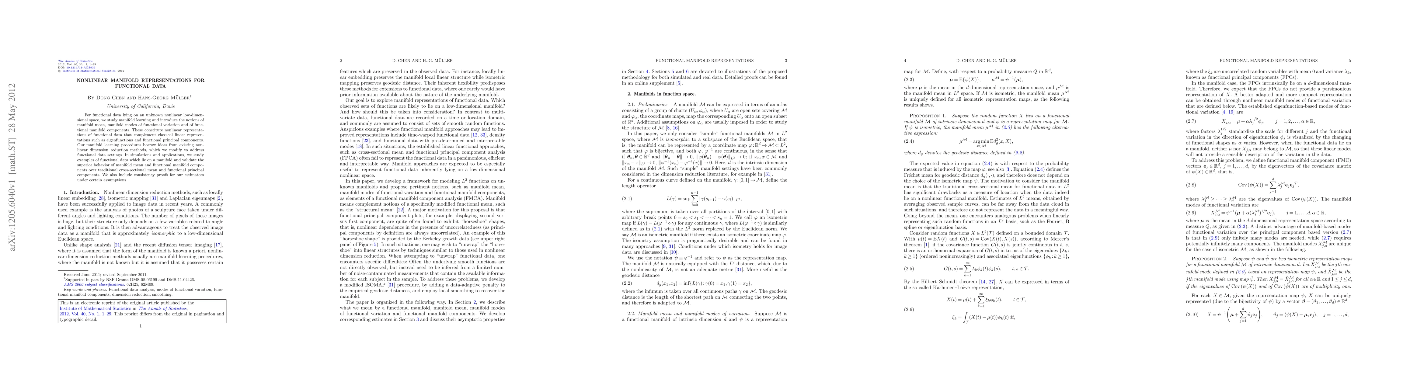 This paper introduces nonlinear manifold representations for functional data, proposing manifold mean, manifold modes, and functional manifold components to complement linear methods. The authors adapt existing nonlinear dimension reduction techniques for functional data and demonstrate their effectiveness through simulations and applications, providing consistency proofs for their estimators.