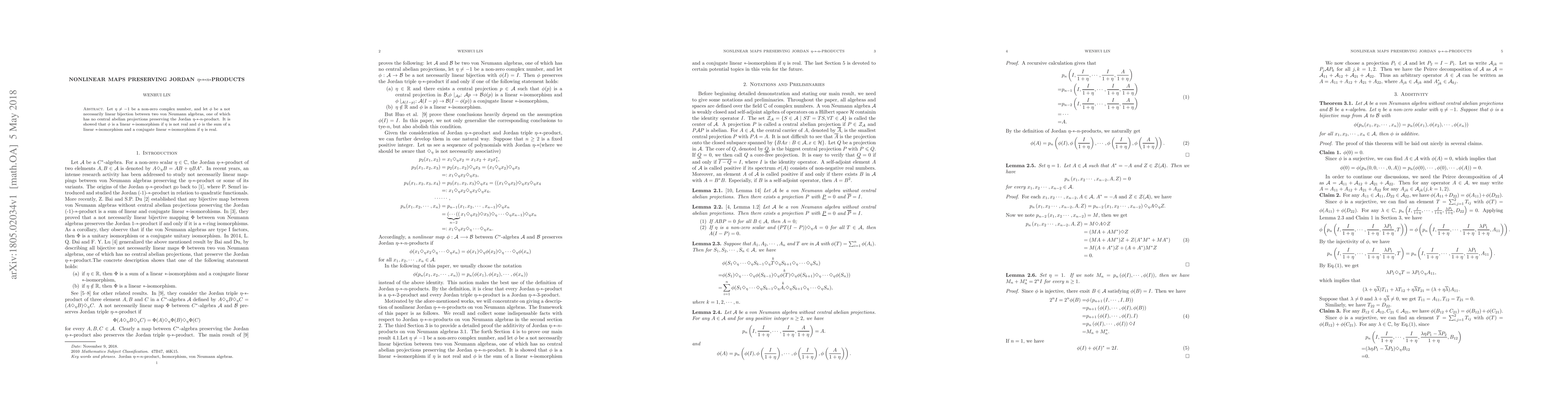 Let $\eta\neq -1$ be a non-zero complex number, and let $\phi$ be a not necessarily linear bijection between two von Neumann algebras, one of which has no central abelian projections preserving the Jordan $\eta$-$\ast$-$n$-product. It is showed that $\phi$ is a linear $\ast$-isomorphism if $\eta$ is not real and $\phi$ is the sum of a linear $\ast$-isomorphism and a conjugate linear $\ast$-isomorphism if $\eta$ is real.