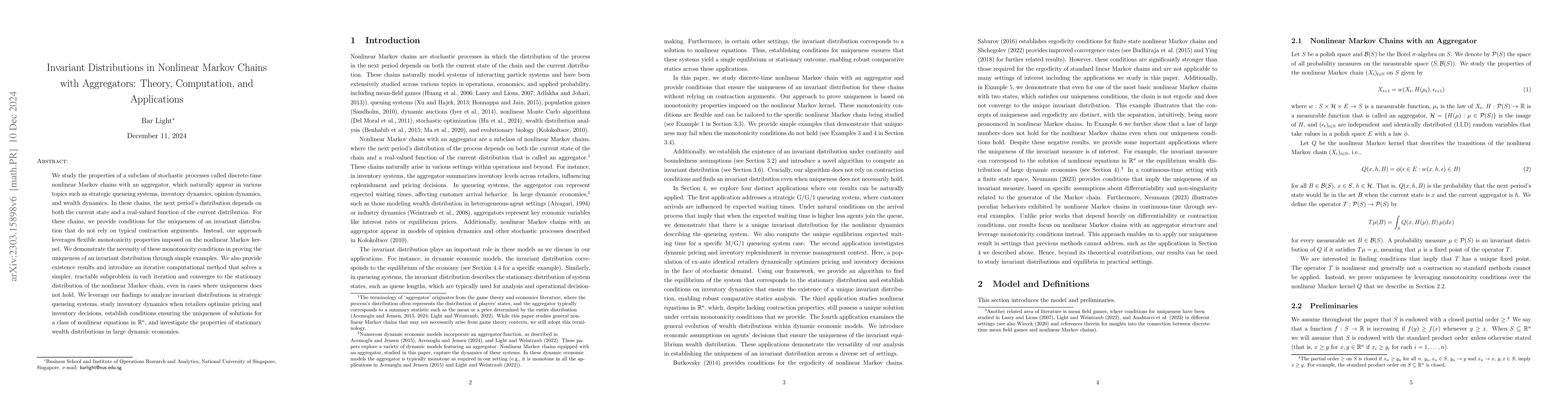 This paper studies discrete-time nonlinear Markov chains with an aggregator, providing conditions for the uniqueness of an invariant distribution without contraction arguments, and applying these findings to strategic queueing systems, nonlinear equation solutions, and wealth distributions in dynamic economies.
