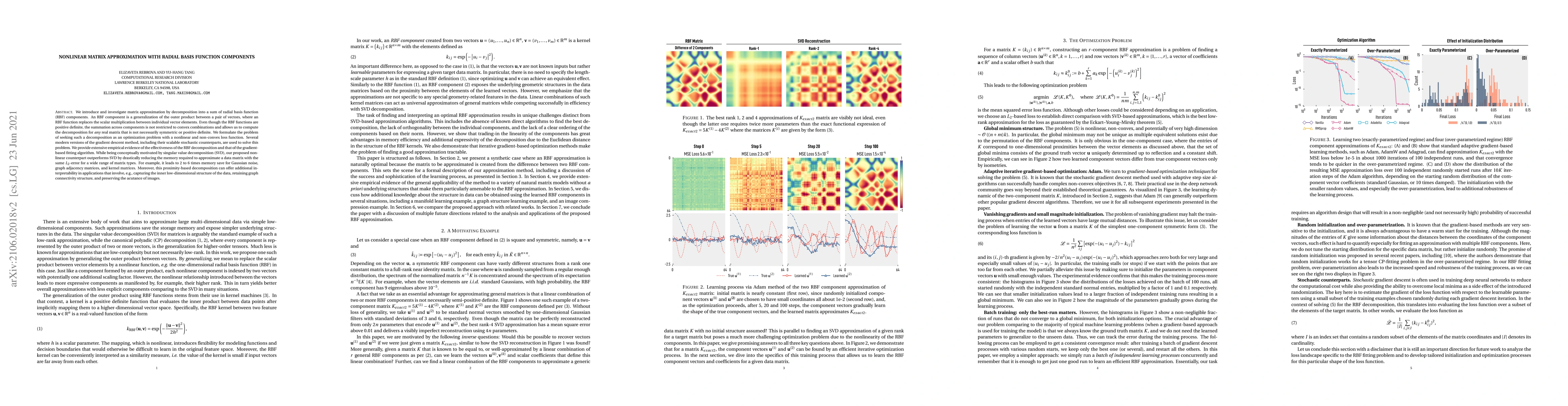 We introduce and investigate matrix approximation by decomposition into a sum of radial basis function (RBF) components. An RBF component is a generalization of the outer product between a pair of vectors, where an RBF function replaces the scalar multiplication between individual vector elements. Even though the RBF functions are positive definite, the summation across components is not restricted to convex combinations and allows us to compute the decomposition for any real matrix that is not necessarily symmetric or positive definite. We formulate the problem of seeking such a decomposition as an optimization problem with a nonlinear and non-convex loss function. Several modern versions of the gradient descent method, including their scalable stochastic counterparts, are used to solve this problem. We provide extensive empirical evidence of the effectiveness of the RBF decomposition and that of the gradient-based fitting algorithm. While being conceptually motivated by singular value decomposition (SVD), our proposed nonlinear counterpart outperforms SVD by drastically reducing the memory required to approximate a data matrix with the same L2 error for a wide range of matrix types. For example, it leads to 2 to 6 times memory save for Gaussian noise, graph adjacency matrices, and kernel matrices. Moreover, this proximity-based decomposition can offer additional interpretability in applications that involve, e.g., capturing the inner low-dimensional structure of the data, retaining graph connectivity structure, and preserving the acutance of images.