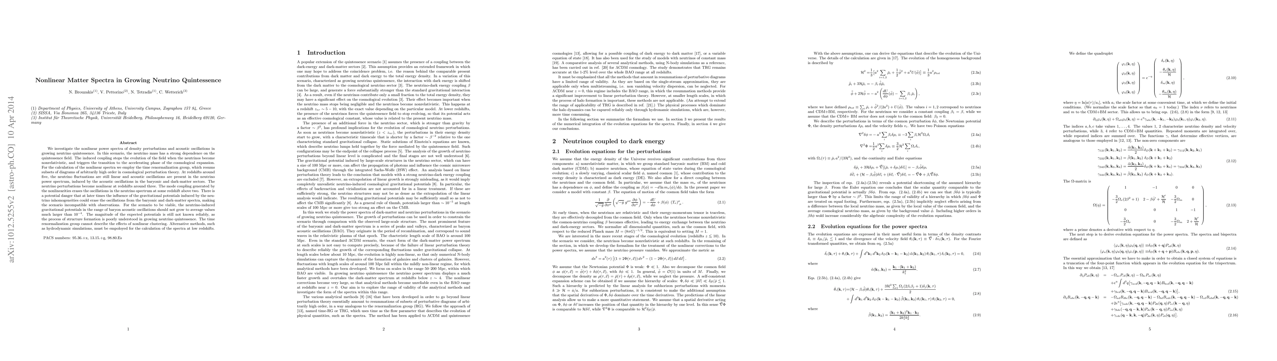 We investigate the nonlinear power spectra of density perturbations and acoustic oscillations in growing neutrino quintessence. In this scenario, the neutrino mass has a strong dependence on the quintessence field. The induced coupling stops the evolution of the field when the neutrinos become nonrelativistic, and triggers the transition to the accelerating phase of the cosmological expansion. At redshifts around five, the neutrino fluctuations are still linear and acoustic oscillations are present in the neutrino power spectrum, induced by the acoustic oscillations in the baryonic and dark-matter sectors. The neutrino perturbations become nonlinear at redshifts around three. The mode coupling generated by the nonlinearities erases the oscillations in the neutrino spectrum at some redshift above two. There is a potential danger that at later times the influence of the gravitational potentials induced by the neutrino inhomogeneities could erase the oscillations from the baryonic and dark-matter spectra, making the scenario incompatible with observations. For the scenario to be viable, the neutrino-induced gravitational potentials in the range of baryonic acoustic oscillations should not grow to average values much larger than 10^{-4}. The magnitude of the expected potentials is still not known reliably, as the process of structure formation is poorly understood in growing neutrino quintessence.