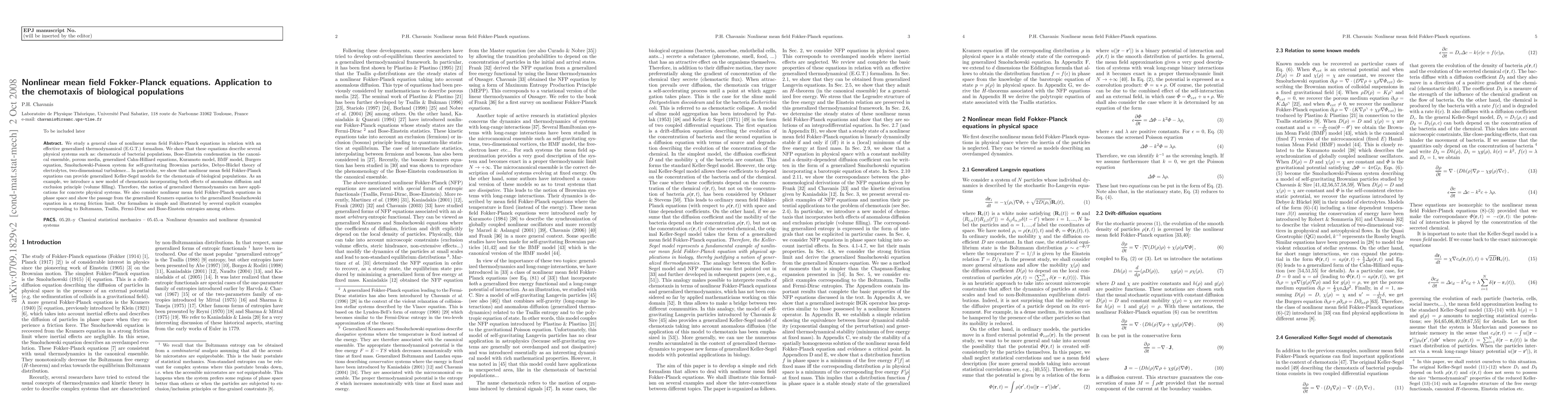 This paper explores nonlinear mean field Fokker-Planck equations and their applications to various physical systems, including chemotaxis in biological populations. It introduces a generalized thermodynamical formalism that can describe phenomena like bacterial chemotaxis, Bose-Einstein condensation, and porous media flow, and proposes a new chemotaxis model incorporating anomalous diffusion and volume exclusion.