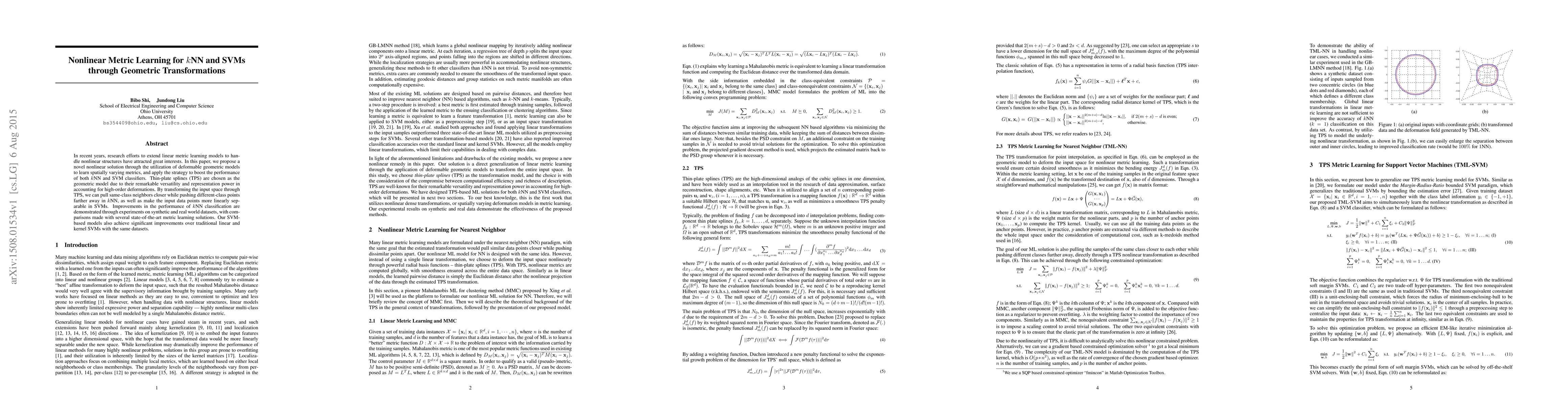 In recent years, research efforts to extend linear metric learning models to handle nonlinear structures have attracted great interests. In this paper, we propose a novel nonlinear solution through the utilization of deformable geometric models to learn spatially varying metrics, and apply the strategy to boost the performance of both kNN and SVM classifiers. Thin-plate splines (TPS) are chosen as the geometric model due to their remarkable versatility and representation power in accounting for high-order deformations. By transforming the input space through TPS, we can pull same-class neighbors closer while pushing different-class points farther away in kNN, as well as make the input data points more linearly separable in SVMs. Improvements in the performance of kNN classification are demonstrated through experiments on synthetic and real world datasets, with comparisons made with several state-of-the-art metric learning solutions. Our SVM-based models also achieve significant improvements over traditional linear and kernel SVMs with the same datasets.