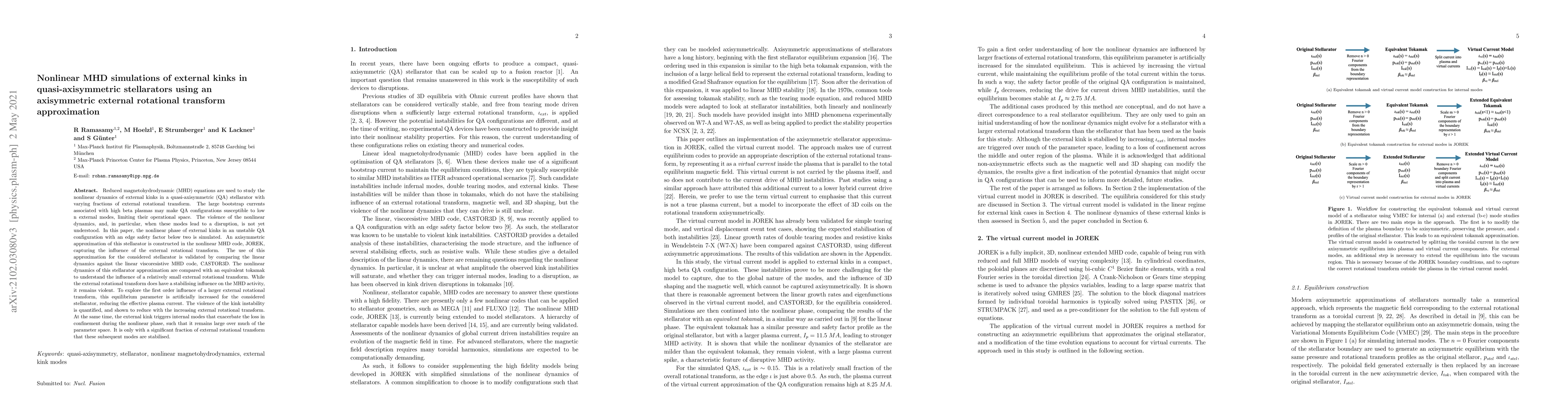 This paper uses nonlinear MHD simulations to study the dynamics of external kinks in quasi-axisymmetric stellarators, revealing that while an external rotational transform can stabilize MHD activity, it still leads to significant disruption and confinement loss unless a substantial transform is applied. The study employs an axisymmetric approximation in the JOREK code to explore these effects.