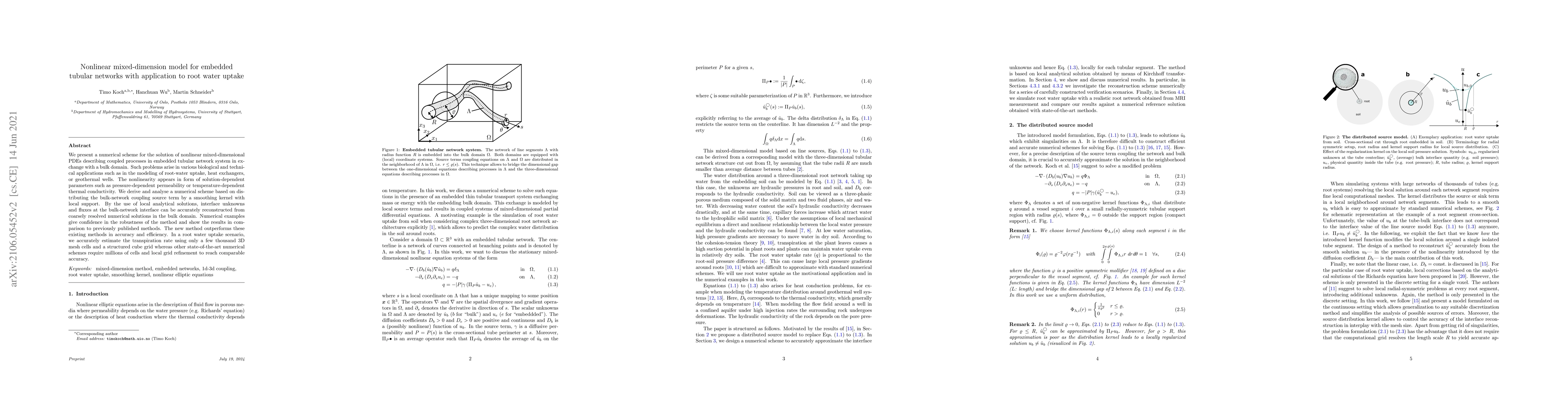 This paper introduces a numerical scheme for solving nonlinear mixed-dimensional PDEs in embedded tubular networks, focusing on applications like root water uptake. The proposed method efficiently estimates transpiration rates using significantly fewer computational resources compared to existing methods.