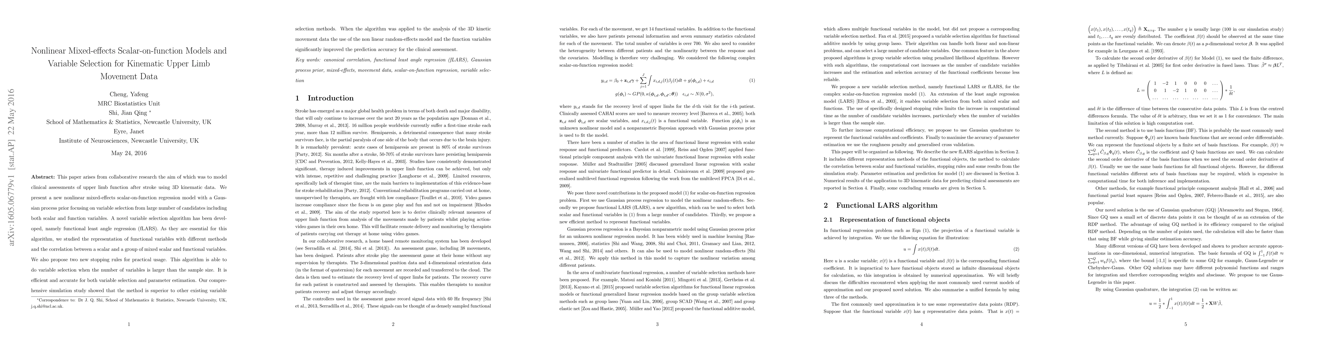 This paper introduces a novel nonlinear mixed-effects scalar-on-function regression model for modeling 3D kinematic data of upper limb movement post-stroke, employing a Gaussian process prior and a new variable selection algorithm called functional least angle regression (fLARS). The method shows superior performance in variable selection and parameter estimation, improving prediction accuracy for clinical assessments.