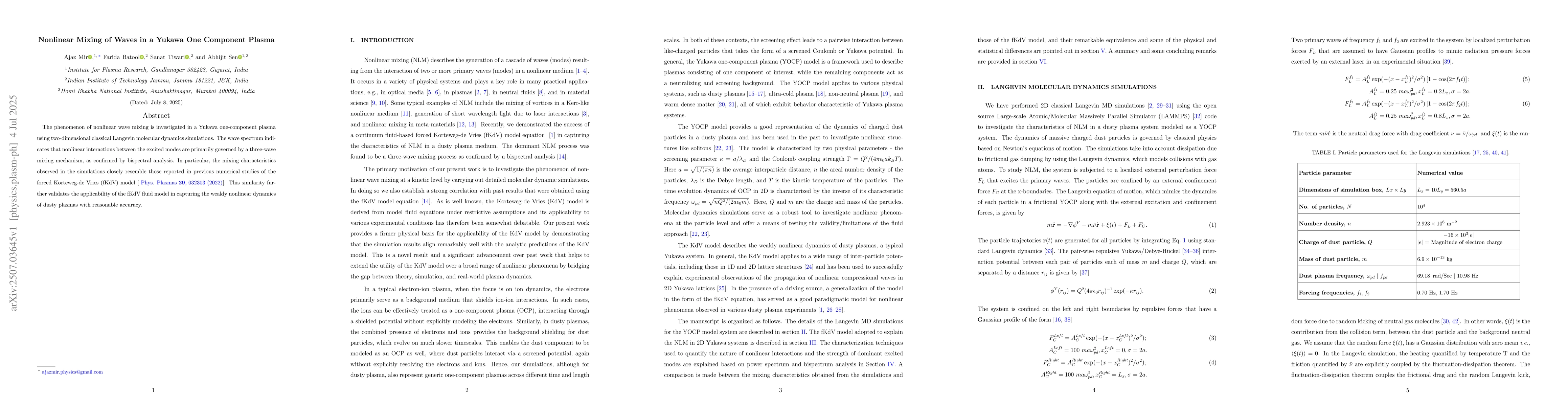 The phenomenon of nonlinear wave mixing is investigated in a Yukawa one-component plasma using two-dimensional classical Langevin molecular dynamics simulations. The wave spectrum indicates that nonlinear interactions between the excited modes are primarily governed by a three-wave mixing mechanism, as confirmed by bispectral analysis. In particular, the mixing characteristics observed in the simulations closely resemble those reported in previous numerical studies of the forced Korteweg-de Vries (fKdV) model [ Phys. Plasmas 29, 032303 (2022)]. This similarity further validates the applicability of the fKdV fluid model in capturing the weakly nonlinear dynamics of dusty plasmas with reasonable accuracy.
