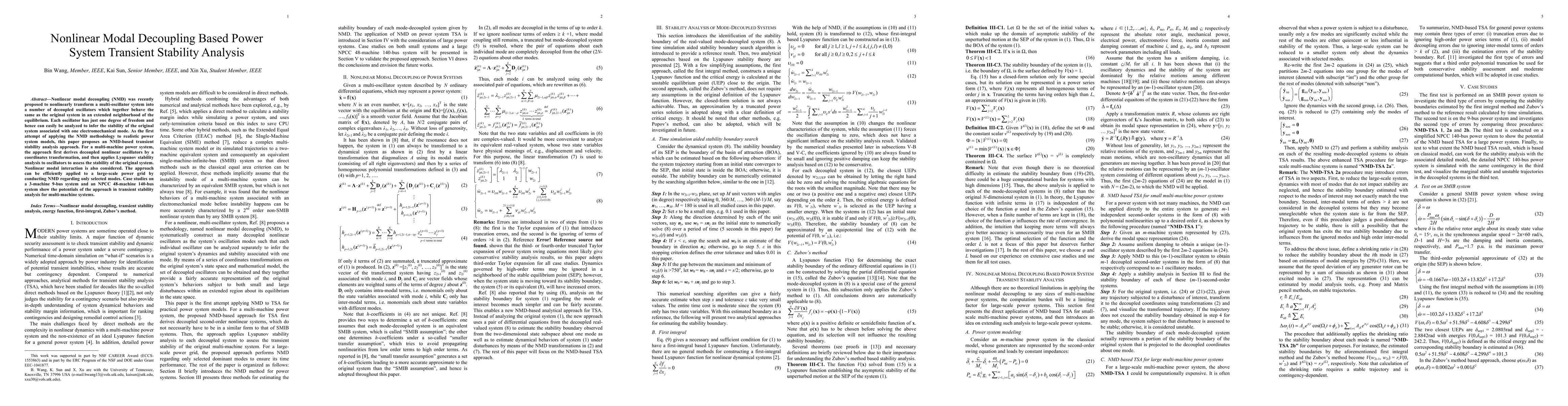 This paper proposes a nonlinear modal decoupling (NMD) methodology for transient stability analysis in power systems, transforming multi-oscillator systems into decoupled oscillators for easier stability assessment. The NMD approach applies Lyapunov stability analysis to these oscillators, demonstrating its effectiveness in large-scale power grids through case studies on both small and large systems.
