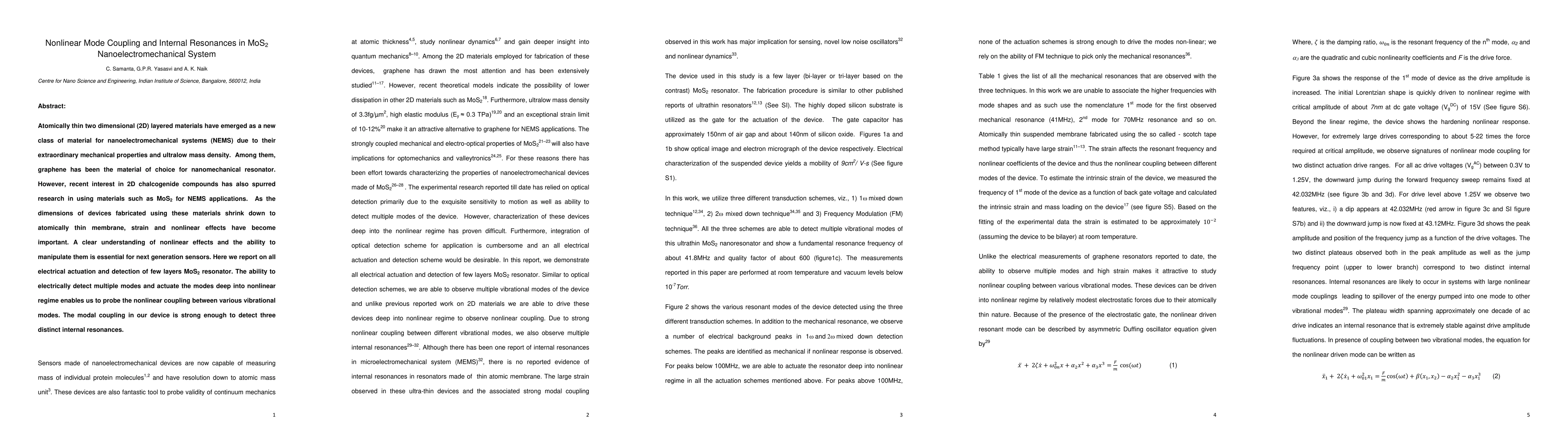 Atomically thin two dimensional (2D) layered materials have emerged as a new class of material for nanoelectromechanical systems (NEMS) due to their extraordinary mechanical properties and ultralow mass density. Among them, graphene has been the material of choice for nanomechanical resonator. However, recent interest in 2D chalcogenide compounds has also spurred research in using materials such as MoS2 for NEMS applications. As the dimensions of devices fabricated using these materials shrink down to atomically thin membrane, strain and nonlinear effects have become important. A clear understanding of nonlinear effects and the ability to manipulate them is essential for next generation sensors. Here we report on all electrical actuation and detection of few layers MoS2 resonator. The ability to electrically detect multiple modes and actuate the modes deep into nonlinear regime enables us to probe the nonlinear coupling between various vibrational modes. The modal coupling in our device is strong enough to detect three distinct internal resonances.