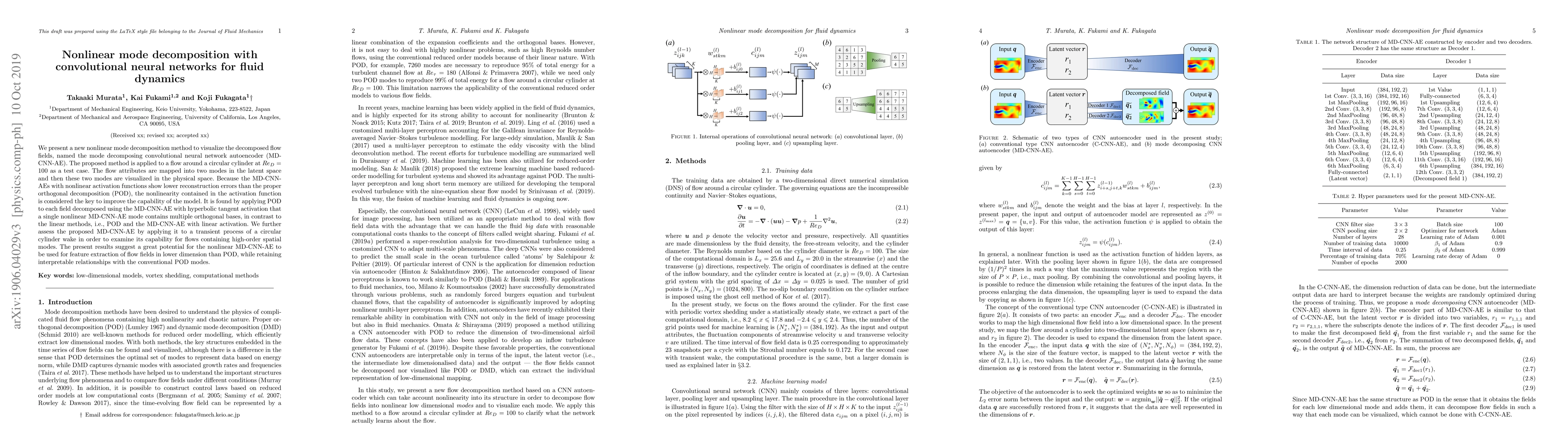 We present a new nonlinear mode decomposition method to visualize the decomposed flow fields, named the mode decomposing convolutional neural network autoencoder (MD-CNN-AE). The proposed method is applied to a flow around a circular cylinder at $Re_D=100$ as a test case. The flow attributes are mapped into two modes in the latent space and then these two modes are visualized in the physical space. Because the MD-CNN-AEs with nonlinear activation functions show lower reconstruction errors than the proper orthogonal decomposition (POD), the nonlinearity contained in the activation function is considered the key to improve the capability of the model. It is found by applying POD to each field decomposed using the MD-CNN-AE with hyperbolic tangent activation that a single nonlinear MD-CNN-AE mode contains multiple orthogonal bases, in contrast to the linear methods, i.e., POD and the MD-CNN-AE with linear activation. We further assess the proposed MD-CNN-AE by applying it to a transient process of a circular cylinder wake in order to examine its capability for flows containing high-order spatial modes. The present results suggest a great potential for the nonlinear MD-CNN-AE to be used for feature extraction of flow fields in lower dimension than POD, while retaining interpretable relationships with the conventional POD modes.