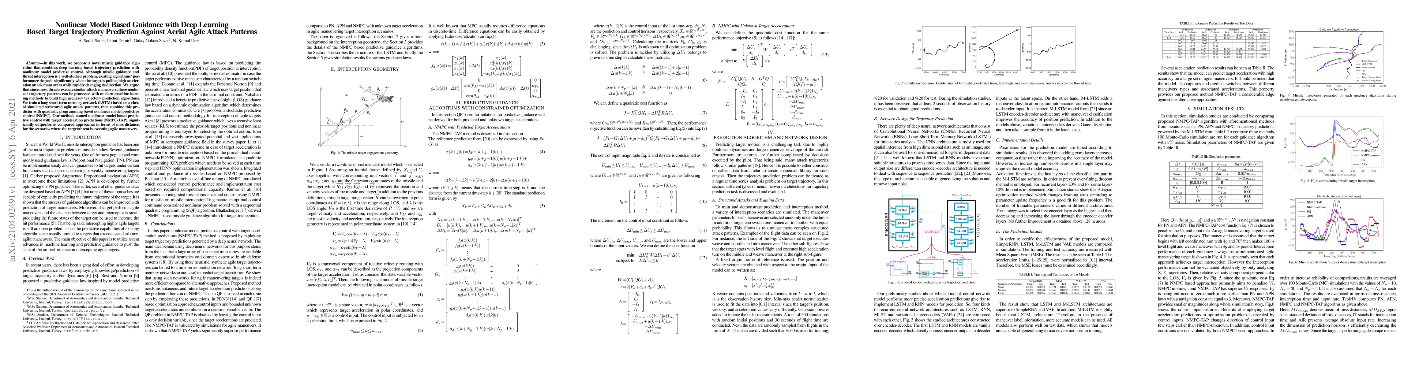 In this work, we propose a novel missile guidance algorithm that combines deep learning based trajectory prediction with nonlinear model predictive control. Although missile guidance and threat interception is a well-studied problem, existing algorithms' performance degrades significantly when the target is pulling high acceleration attack maneuvers while rapidly changing its direction. We argue that since most threats execute similar attack maneuvers, these nonlinear trajectory patterns can be processed with modern machine learning methods to build high accuracy trajectory prediction algorithms. We train a long short-term memory network (LSTM) based on a class of simulated structured agile attack patterns, then combine this predictor with quadratic programming based nonlinear model predictive control (NMPC). Our method, named nonlinear model based predictive control with target acceleration predictions (NMPC-TAP), significantly outperforms compared approaches in terms of miss distance, for the scenarios where the target/threat is executing agile maneuvers.
