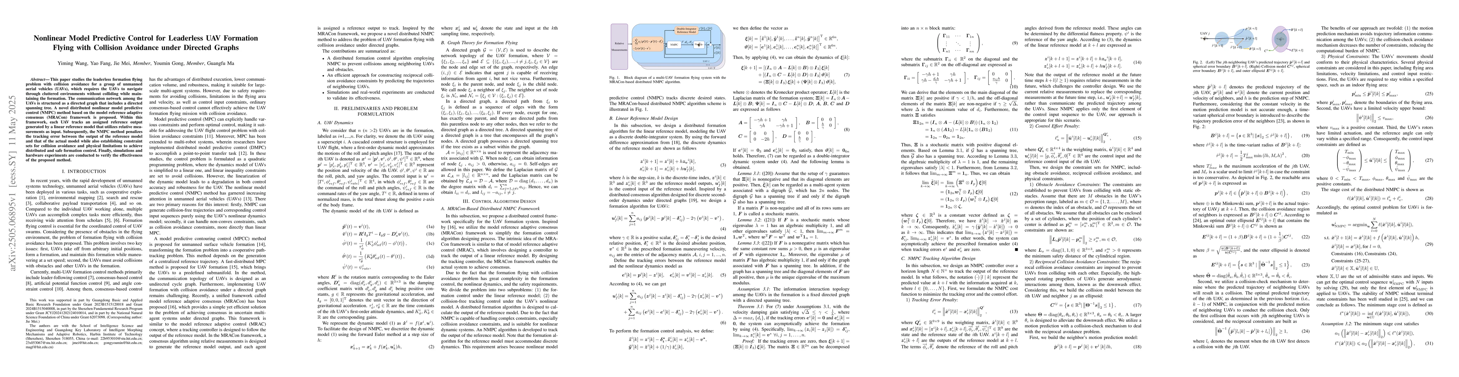 This work differs from existing research by integrating the MRACon framework with NMPC for leaderless UAV formation flying under directed graphs, ensuring both formation maintenance and collision avoidance.