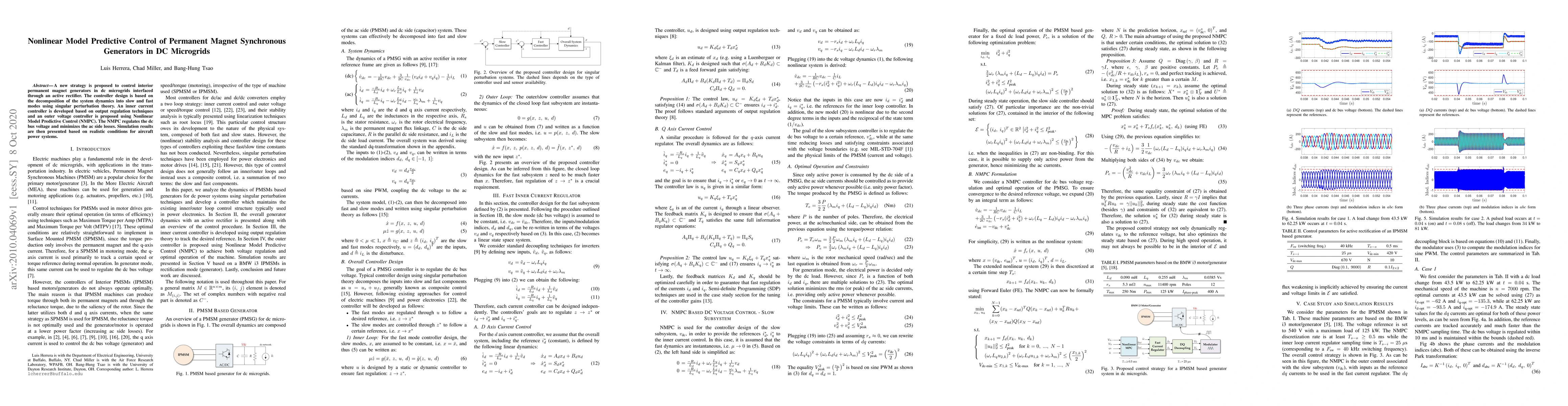 A new strategy is proposed to control interior permanent magnet generators in dc microgrids interfaced through an active rectifier. The controller design is based on the decomposition of the system dynamics into slow and fast modes using singular perturbation theory. An inner current controller is developed based on output regulation techniques and an outer voltage controller is proposed using Nonlinear Model Predictive Control (NMPC). The NMPC regulates the dc bus voltage and minimizes the ac side losses. Simulation results are then presented based on realistic conditions for aircraft power systems.