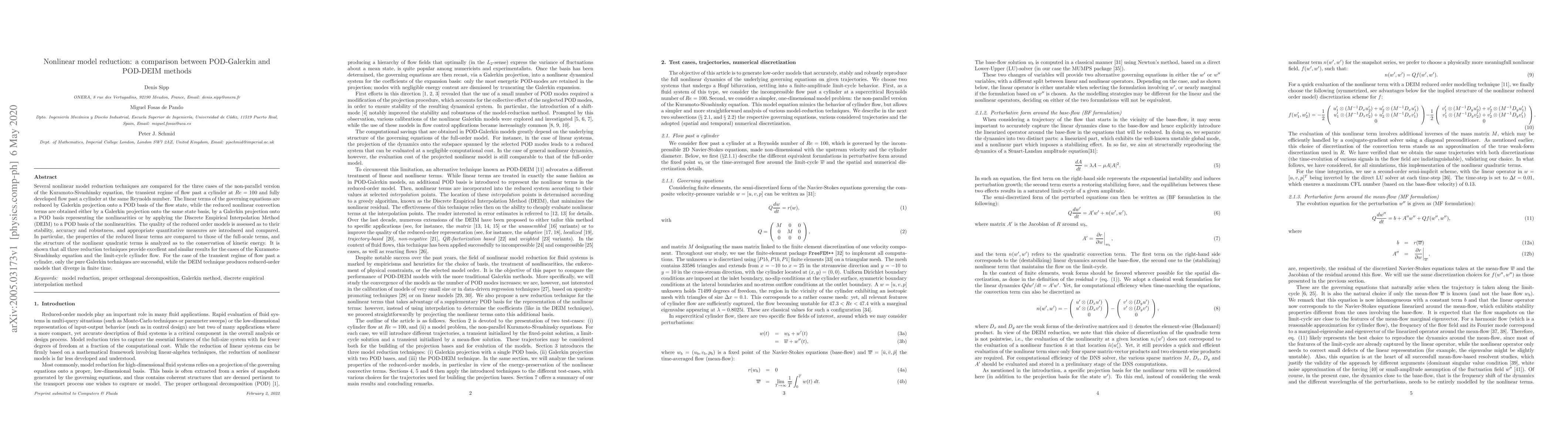 Several nonlinear model reduction techniques are compared for the three cases of the non-parallel version of the Kuramoto-Sivashinsky equation, the transient regime of flow past a cylinder at $Re=100$ and fully developed flow past a cylinder at the same Reynolds number. The linear terms of the governing equations are reduced by Galerkin projection onto a POD basis of the flow state, while the reduced nonlinear convection terms are obtained either by a Galerkin projection onto the same state basis, by a Galerkin projection onto a POD basis representing the nonlinearities or by applying the Discrete Empirical Interpolation Method (DEIM) to a POD basis of the nonlinearities. The quality of the reduced order models is assessed as to their stability, accuracy and robustness, and appropriate quantitative measures are introduced and compared. In particular, the properties of the reduced linear terms are compared to those of the full-scale terms, and the structure of the nonlinear quadratic terms is analyzed as to the conservation of kinetic energy. It is shown that all three reduction techniques provide excellent and similar results for the cases of the Kuramoto-Sivashinsky equation and the limit-cycle cylinder flow. For the case of the transient regime of flow past a cylinder, only the pure Galerkin techniques are successful, while the DEIM technique produces reduced-order models that diverge in finite time.