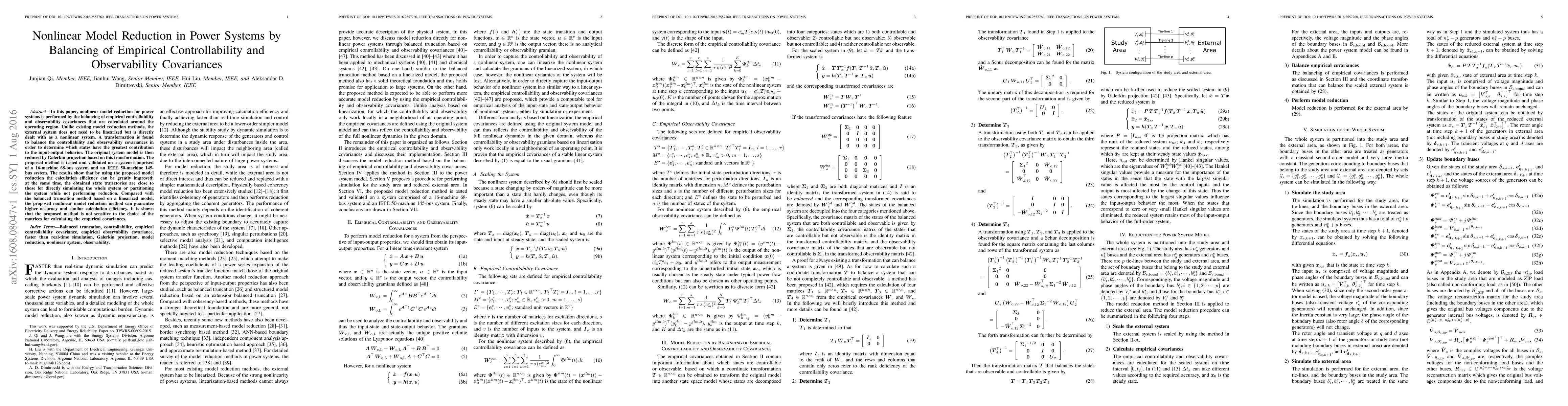 In this paper, nonlinear model reduction for power systems is performed by the balancing of empirical controllability and observability covariances that are calculated around the operating region. Unlike existing model reduction methods, the external system does not need to be linearized but is directly dealt with as a nonlinear system. A transformation is found to balance the controllability and observability covariances in order to determine which states have the greatest contribution to the input-output behavior. The original system model is then reduced by Galerkin projection based on this transformation. The proposed method is tested and validated on a system comprised of a 16-machine 68-bus system and an IEEE 50-machine 145-bus system. The results show that by using the proposed model reduction the calculation efficiency can be greatly improved; at the same time, the obtained state trajectories are close to those for directly simulating the whole system or partitioning the system while not performing reduction. Compared with the balanced truncation method based on a linearized model, the proposed nonlinear model reduction method can guarantee higher accuracy and similar calculation efficiency. It is shown that the proposed method is not sensitive to the choice of the matrices for calculating the empirical covariances.