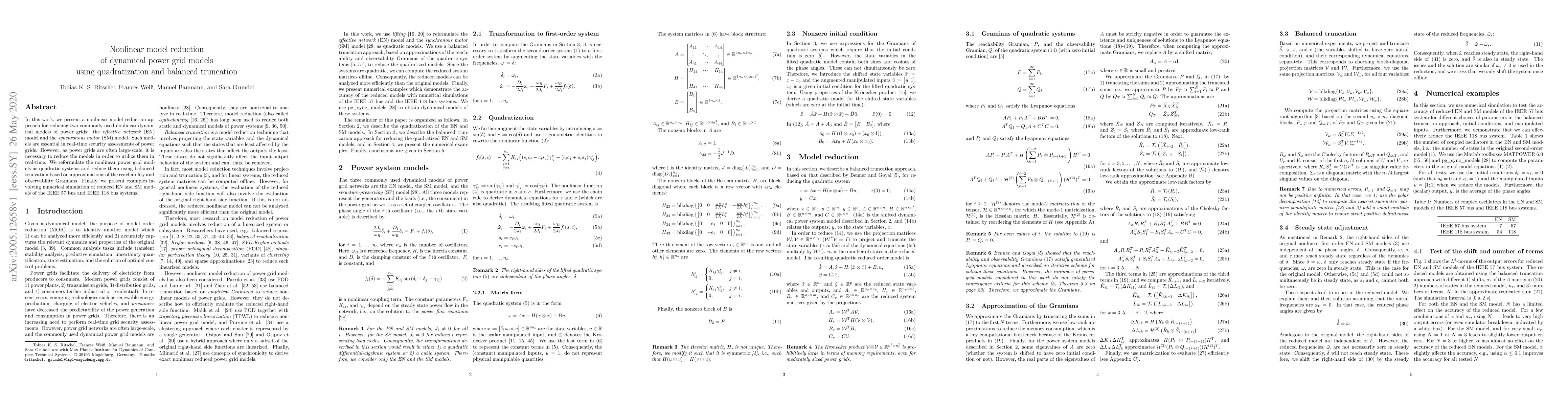 In this work, we present a nonlinear model reduction approach for reducing two commonly used nonlinear dynamical models of power grids: the effective network (EN) model and the synchronous motor (SM) model. Such models are essential in real-time security assessments of power grids. However, as power grids are often large-scale, it is necessary to reduce the models in order to utilize them in real-time. We reformulate the nonlinear power grid models as quadratic systems and reduce them using balanced truncation based on approximations of the reachability and observability Gramians. Finally, we present examples involving numerical simulation of reduced EN and SM models of the IEEE 57 bus and IEEE 118 bus systems.