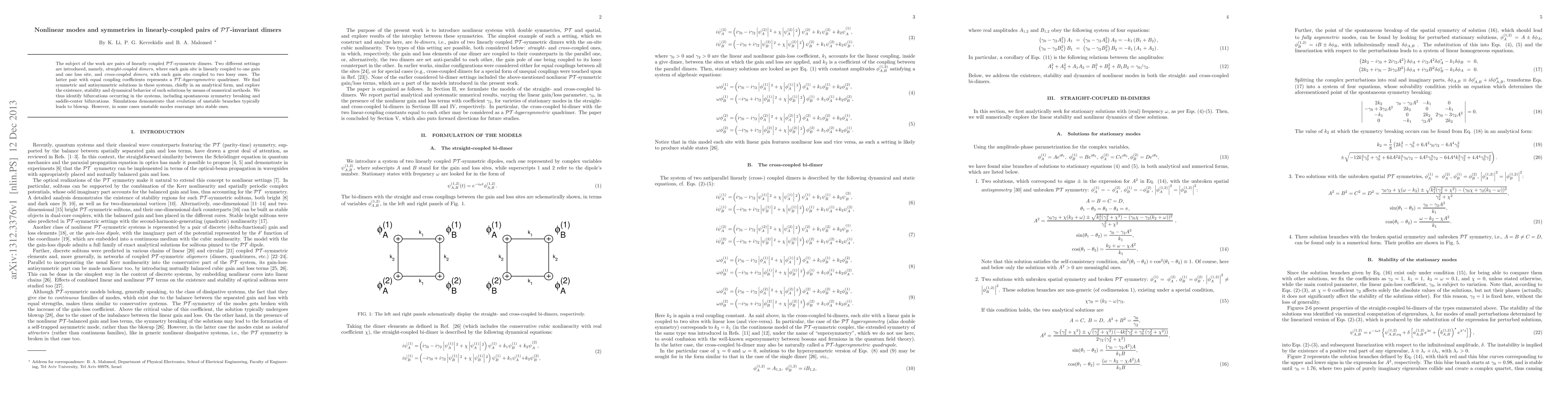 The subject of the work are pairs of linearly coupled PT-symmetric dimers. Two different settings are introduced, namely, straight-coupled dimers, where each gain site is linearly coupled to one gain and one loss site, and cross-coupled dimers, with each gain site coupled to two lossy ones. The latter pair with equal coupling coefficients represents a "PT-hypersymmetric" quadrimer. We find symmetric and antisymmetric solutions in these systems, chiefly in an analytical form, and explore the existence, stability and dynamical behavior of such solutions by means of numerical methods. We thus identify bifurcations occurring in the systems, including spontaneous symmetry breaking and saddle-center bifurcations. Simulations demonstrate that evolution of unstable branches typically leads to blowup. However, in some cases unstable modes rearrange into stable ones.