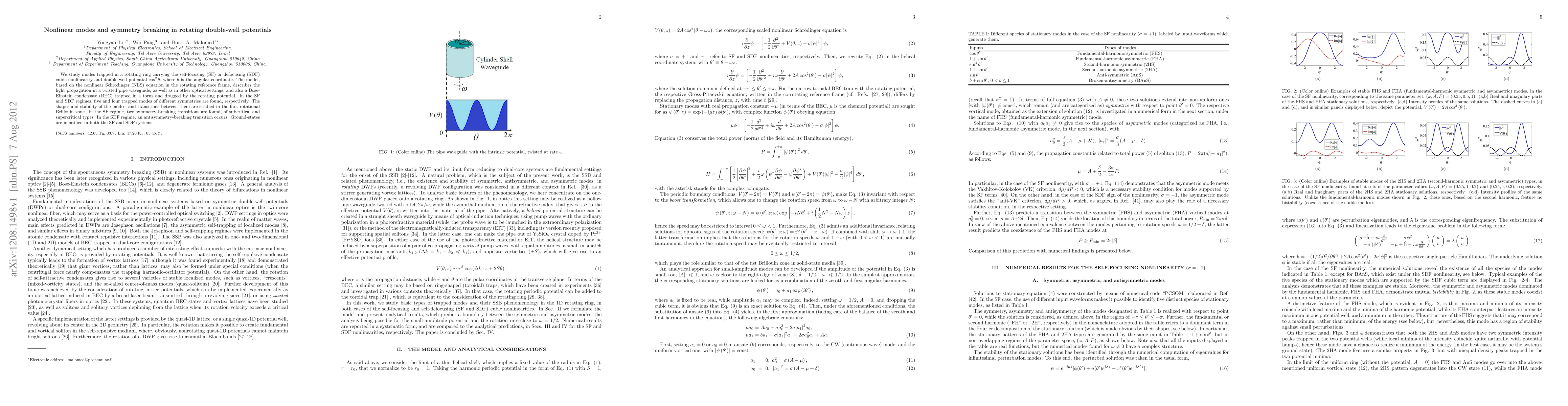 We study modes trapped in a rotating ring carrying the self-focusing (SF) or defocusing (SDF) cubic nonlinearity and double-well potential $\cos^{2}\theta $, where $\theta $ is the angular coordinate. The model, based on the nonlinear Schr\"{o}dinger (NLS) equation in the rotating reference frame, describes the light propagation in a twisted pipe waveguide, as well as in other optical settings, and also a Bose-Einstein condensate (BEC)trapped in a torus and dragged by the rotating potential. In the SF and SDF regimes, five and four trapped modes of different symmetries are found, respectively. The shapes and stability of the modes, and transitions between them are studied in the first rotational Brillouin zone. In the SF regime, two symmetry-breaking transitions are found, of subcritical and supercritical types. In the SDF regime, an antisymmetry-breaking transition occurs. Ground-states are identified in both the SF and SDF systems.