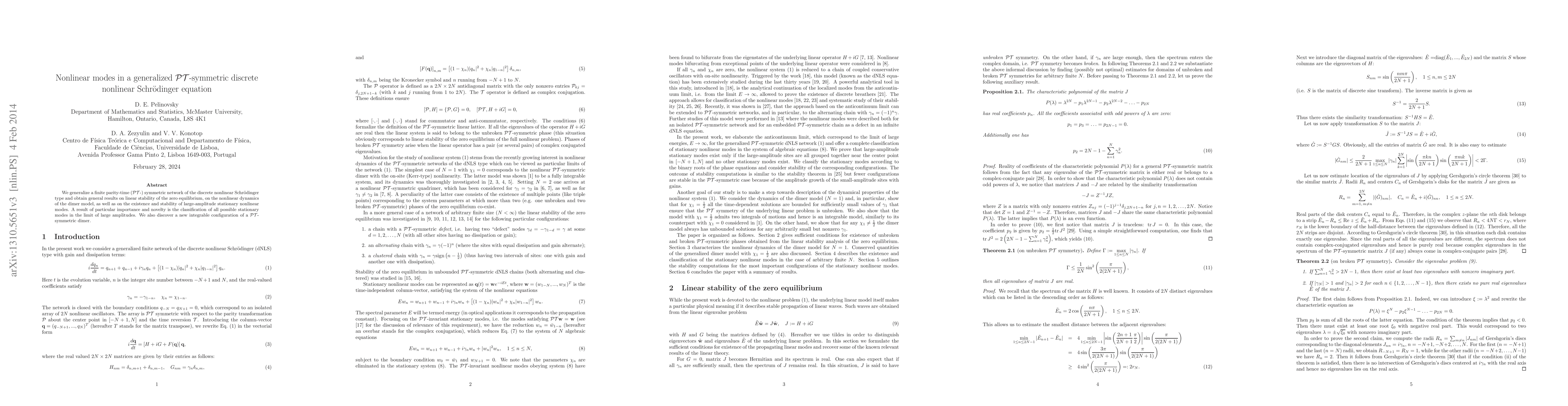 This paper generalizes a ${\cal PT}$-symmetric discrete nonlinear Schrödinger equation, exploring linear stability, nonlinear dynamics, and the existence and stability of large-amplitude stationary modes. It notably classifies all possible stationary modes at large amplitudes and identifies a new integrable ${\cal PT}$-symmetric dimer configuration.