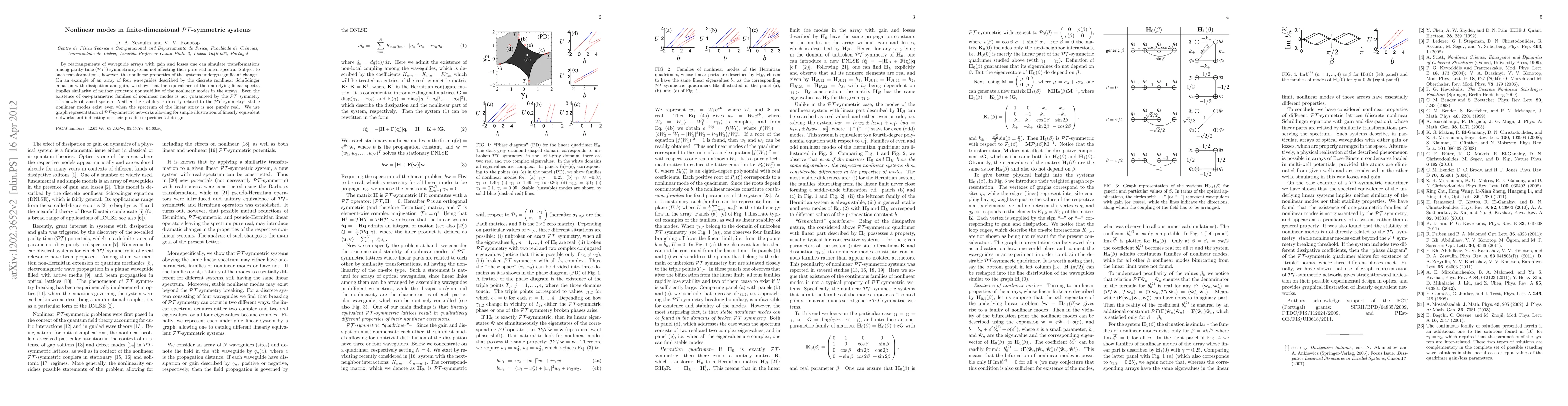 By rearrangements of waveguide arrays with gain and losses one can simulate transformations among parity-time (PT-) symmetric systems not affecting their pure real linear spectra. Subject to such transformations, however, the nonlinear properties of the systems undergo significant changes. On an example of an array of four waveguides described by the discrete nonlinear Schr\"odinger equation with dissipation and gain, we show that the equivalence of the underlying linear spectra implies similarity of neither structure nor stability of the nonlinear modes in the arrays. Even the existence of one-parametric families of nonlinear modes is not guaranteed by the PT symmetry of a newly obtained system. Neither the stability is directly related to the PT symmetry: stable nonlinear modes exist even when the spectrum of the linear array is not purely real. We use graph representation of PT-symmetric networks allowing for simple illustration of linearly equivalent networks and indicating on their possible experimental design.