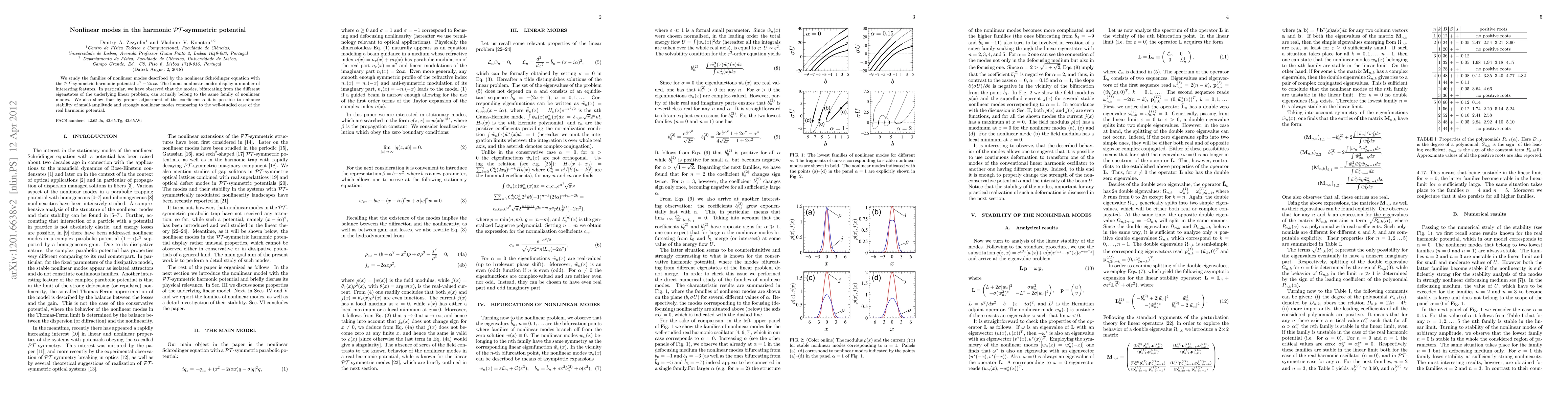 This paper investigates nonlinear modes in the PT-symmetric harmonic potential, revealing that modes bifurcating from different linear eigenstates can belong to the same nonlinear family. Adjusting the coefficient $\alpha$ enhances stability for both small-amplitude and strongly nonlinear modes compared to the real harmonic potential.