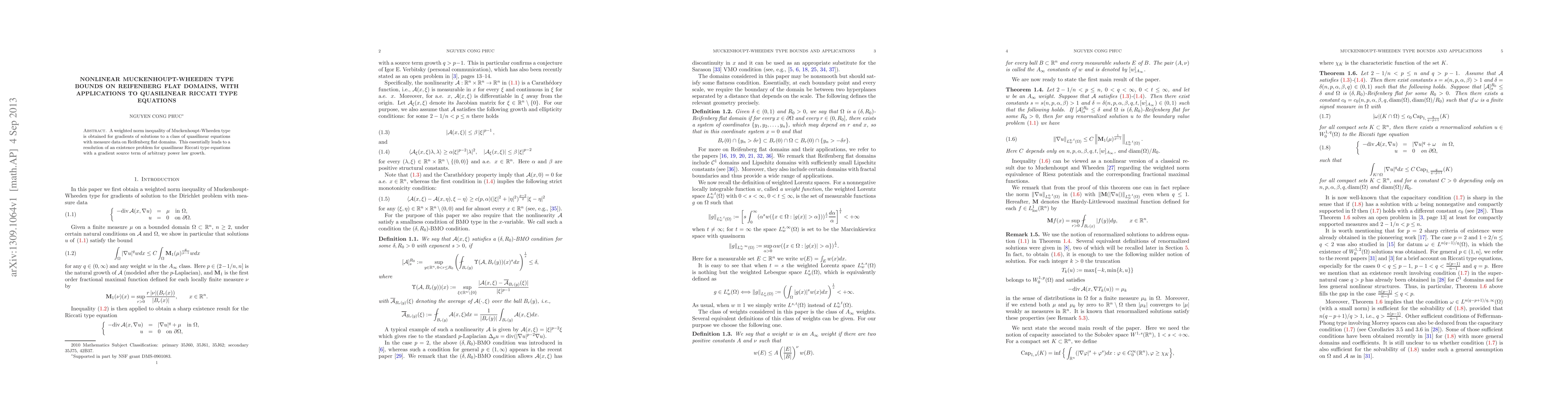 A weighted norm inequality of Muckenhoupt-Wheeden type is obtained for gradients of solutions to a class of quasilinear equations with measure data on Reifenberg flat domains. This essentially leads to a resolution of an existence problem for quasilinear Riccati type equations with a gradient source term of arbitrary power law growth.