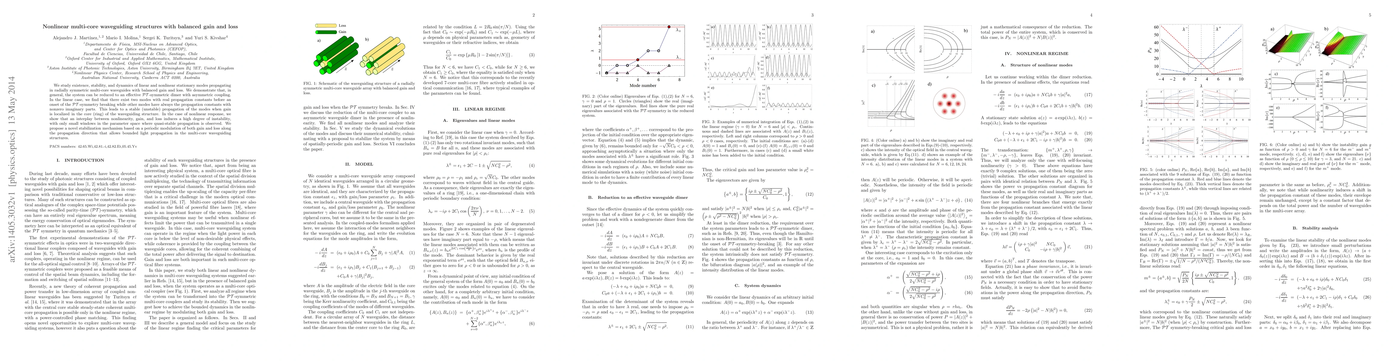 We study existence, stability, and dynamics of linear and nonlinear stationary modes propagating in radially symmetric multi-core waveguides with balanced gain and loss. We demonstrate that, in general, the system can be reduced to an effective ${\cal PT}$-symmetric dimer with asymmetric coupling. In the linear case, we find that there exist two modes with real propagation constants before an onset of the ${\cal PT}$-symmetry breaking while other modes have always the propagation constants with nonzero imaginary parts. This leads to a stable (unstable) propagation of the modes when gain is localized in the core (ring) of the waveguiding structure. In the case of nonlinear response, we show that an interplay between nonlinearity, gain, and loss induces a high degree of instability, with only small windows in the parameter space where quasi-stable propagation is observed. We propose a novel stabilization mechanism based on a periodic modulation of both gain and loss along the propagation direction that allows bounded light propagation in the multi-core waveguiding structures.
