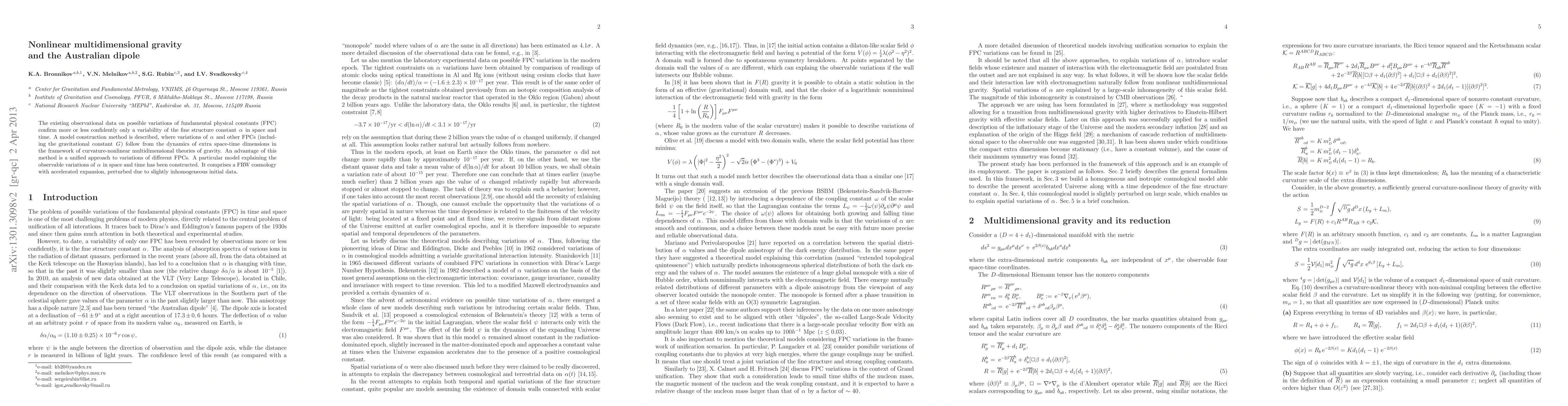 The existing observational data on possible variations of fundamental physical constants (FPC) confirm more or less confidently only a variability of the fine structure constant $\alpha$ in space and time. A model construction method is described, where variations of $\alpha$ and other FPCs (including the gravitational constant $G$) follow from the dynamics of extra space-time dimensions in the framework of curvature-nonlinear multidimensional theories of gravity. An advantage of this method is a unified approach to variations of different FPCs. A particular model explaining the observable variations of $\alpha$ in space and time has been constructed. It comprises a FRW cosmology with accelerated expansion, perturbed due to slightly inhomogeneous initial data.