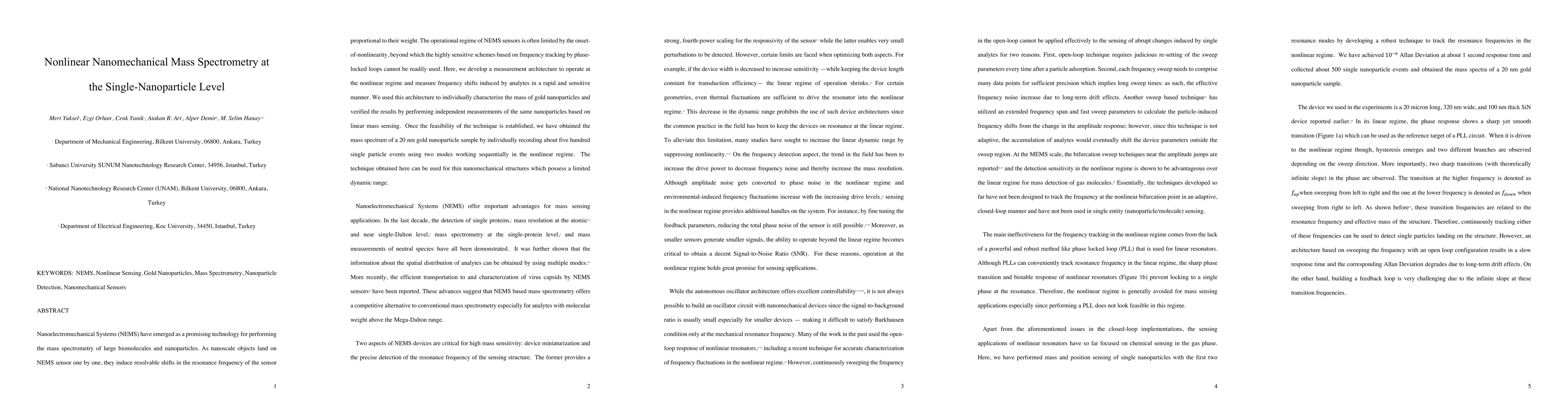 This paper develops a nonlinear nanoelectromechanical system for mass spectrometry at the single-nanoparticle level, enabling rapid and sensitive frequency shift measurement beyond the onset-of-nonlinearity. The technique successfully characterizes the mass of gold nanoparticles and demonstrates its potential for thin nanomechanical structures with limited dynamic range.