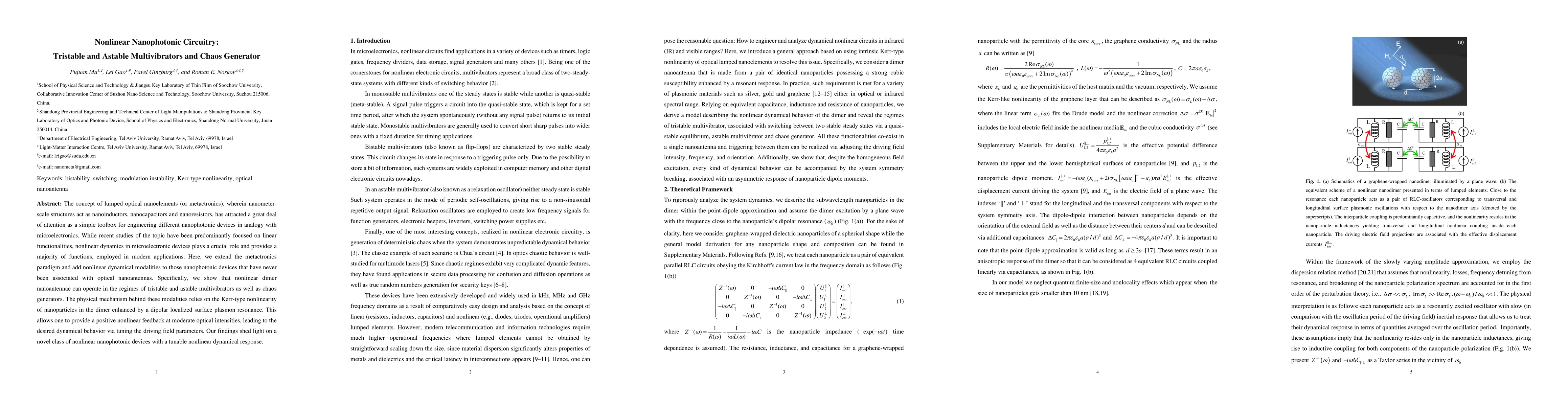 The concept of lumped optical nanoelements (or metactronics), wherein nanometer-scale structures act as nanoinductors, nanocapacitors and nanoresistors, has attracted a great deal of attention as a simple toolbox for engineering different nanophotonic devices in analogy with microelectronics. While recent studies of the topic have been predominantly focused on linear functionalities, nonlinear dynamics in microelectronic devices plays a crucial role and provides a majority of functions, employed in modern applications. Here, we extend the metactronics paradigm and add nonlinear dynamical modalities to those nanophotonic devices that have never been associated with optical nanoantennas. Specifically, we show that nonlinear dimer nanoantennae can operate in the regimes of tristable and astable multivibrators as well as chaos generators. The physical mechanism behind these modalities relies on the Kerr-type nonlinearity of nanoparticles in the dimer enhanced by a dipolar localized surface plasmon resonance. This allows one to provide a positive nonlinear feedback at moderate optical intensities, leading to the desired dynamical behavior via tuning the driving field parameters. Our findings shed light on a novel class of nonlinear nanophotonic devices with a tunable nonlinear dynamical response.
