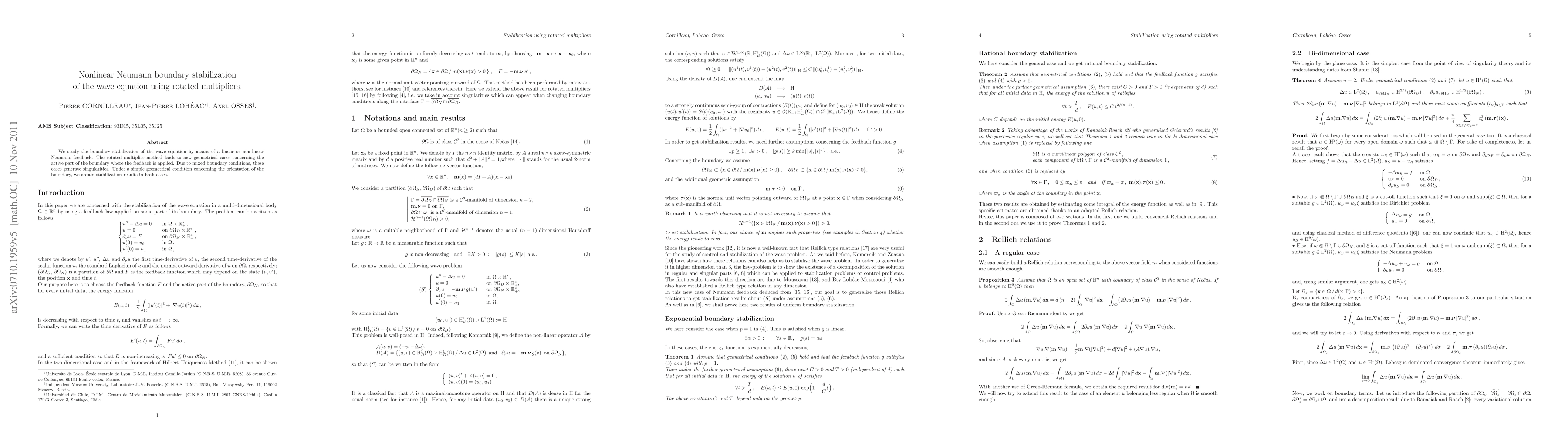 Summary: This paper explores the rotated multipliers method for nonlinear Neumann boundary stabilization of the wave equation, addressing singularities arising from mixed boundary conditions. Under a specific geometrical condition on boundary orientation, it achieves stabilization results for both linear and non-linear Neumann feedback.