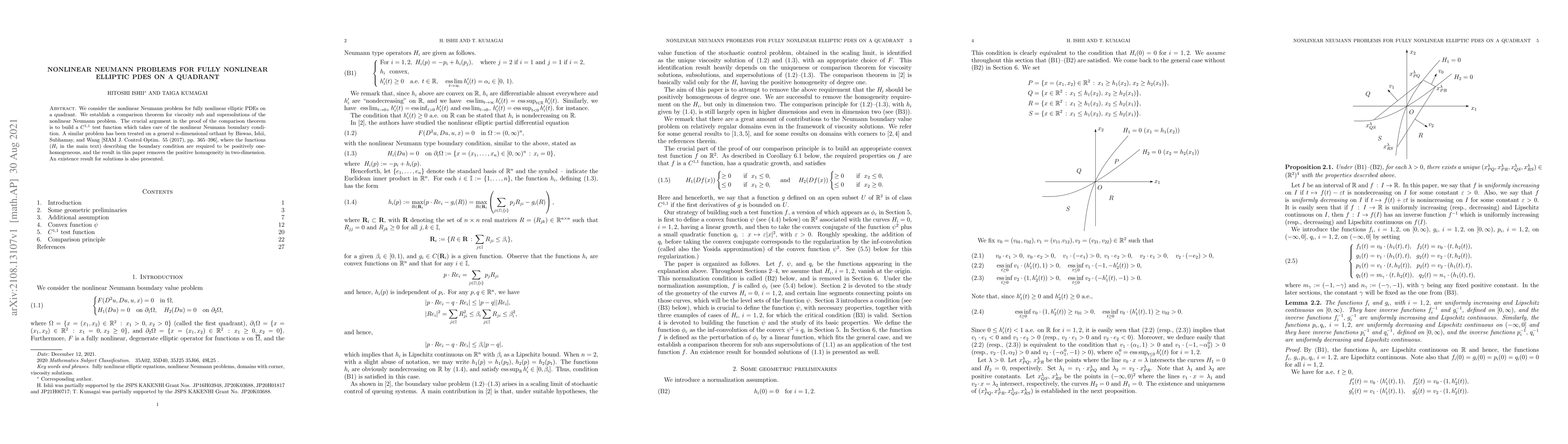 This paper addresses the nonlinear Neumann problem for fully nonlinear elliptic PDEs on a quadrant, establishing a comparison theorem for viscosity sub and supersolutions. It removes the positive homogeneity requirement present in previous studies, presenting a $C^{1,1}$ test function to handle the boundary condition and proving an existence result for solutions.