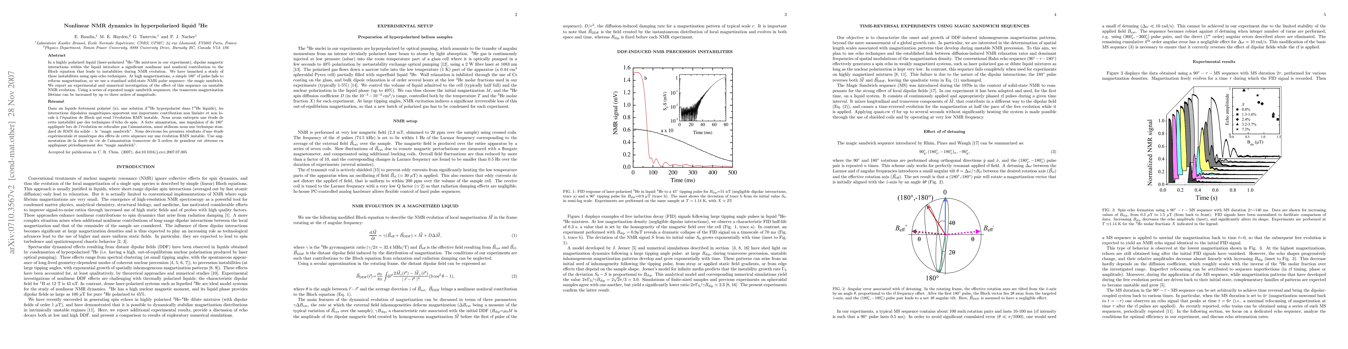 This research investigates nonlinear NMR dynamics in hyperpolarized liquid 3He, finding that dipolar interactions cause instabilities during NMR evolution. By employing a 'magic sandwich' pulse sequence, the team increases the transverse magnetization lifetime by up to three orders of magnitude, both experimentally and numerically.