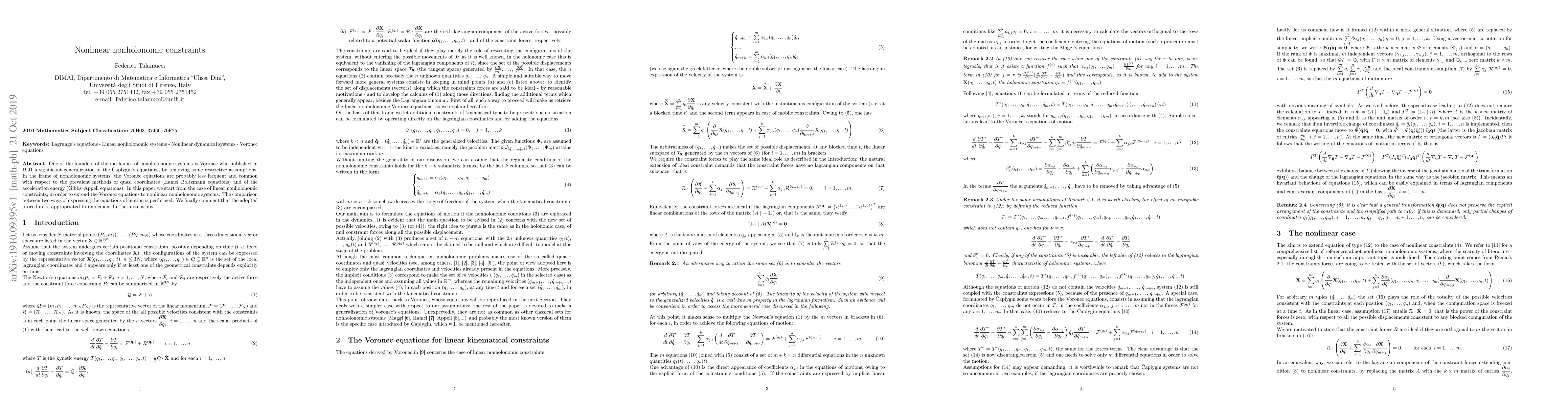 One of the founders of the mechanics of nonoholonomic systems is Voronec who published in 1901 a significant generalization of the Caplygin's equations, by removing some restrictive assumptions. In the frame of nonholonomic systems, the Voronec equations are probably less frequent and common with respect to the prevalent methods of quasi--coordinates (Hamel--Boltzmann equations) and of the acceleration energy (Gibbs--Appell equations). In this paper we start from the case of linear nonholonomic constraints, in order to extend the Voronec equations to nonlinear nonholonomic systems. The comparison between two ways of expressing the equations of motion is performed. We finally comment that the adopted procedure is appropriated to implement further extensions.