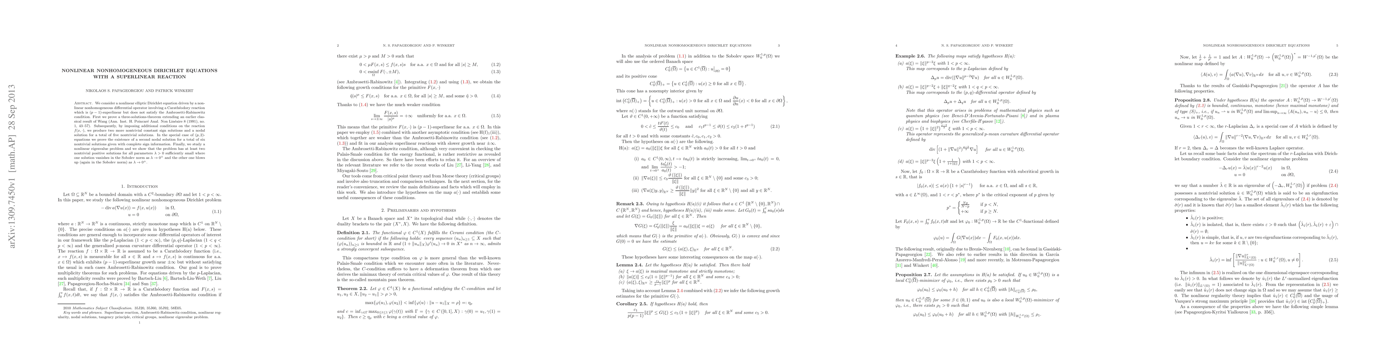 We consider a nonlinear elliptic Dirichlet equation driven by a nonlinear nonhomogeneous differential operator involving a Carath\'{e}odory reaction which is $(p-1)$-superlinear but does not satisfy the Ambrosetti-Rabinowitz condition. First we prove a three-solutions-theorem extending an earlier classical result of Wang (Ann. Inst. H. Poincar\'e Anal. Non Lin\'eaire 8 (1991), no. 1, 43--57). Subsequently, by imposing additional conditions on the reaction $f(x,\cdot)$, we produce two more nontrivial constant sign solutions and a nodal solution for a total of five nontrivial solutions. In the special case of $(p,2)$-equations we prove the existence of a second nodal solution for a total of six nontrivial solutions given with complete sign information. Finally, we study a nonlinear eigenvalue problem and we show that the problem has at least two nontrivial positive solutions for all parameters $\lambda>0$ sufficiently small where one solution vanishes in the Sobolev norm as $\lambda \to 0^+$ and the other one blows up (again in the Sobolev norm) as $\lambda \to 0^+$.