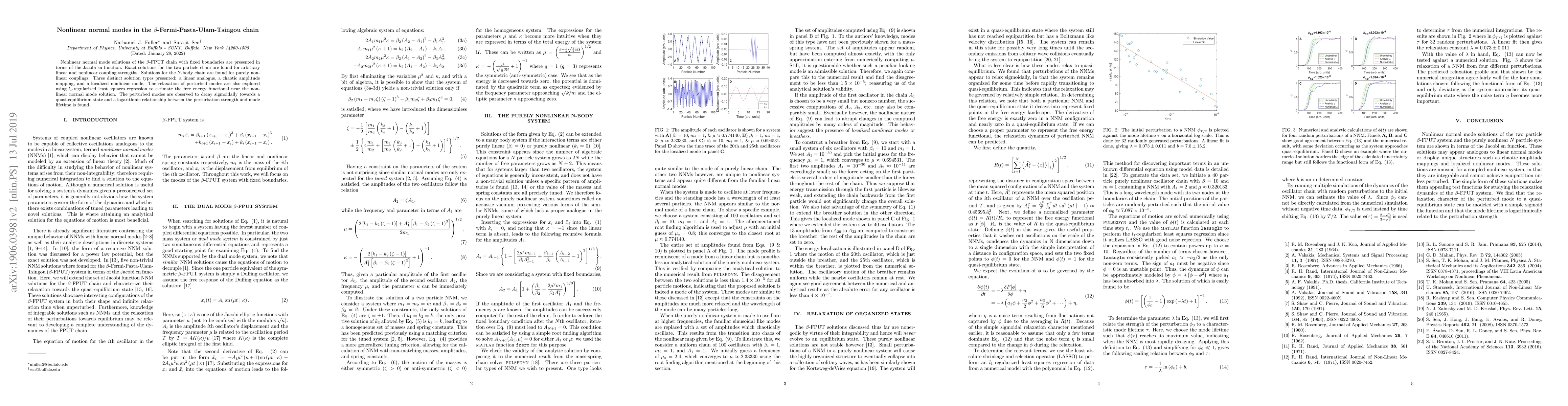 Nonlinear normal mode solutions of the $\beta$-FPUT chain with fixed boundaries are presented in terms of the Jacobi sn function. Exact solutions for the two particle chain are found for arbitrary linear and nonlinear coupling strengths. Solutions for the N-body chain are found for purely nonlinear couplings. Three distinct solution types presented: a linear analogue, a chaotic amplitude mapping, and a localized nonlinear mode. The relaxation of perturbed modes are also explored using $l_{1}$-regularized least squares regression to estimate the free energy functional near the nonlinear normal mode solution. The perturbed modes are observed to decay sigmoidally towards a quasi-equilibrium state and a logarithmic relationship between the perturbation strength and mode lifetime is found.