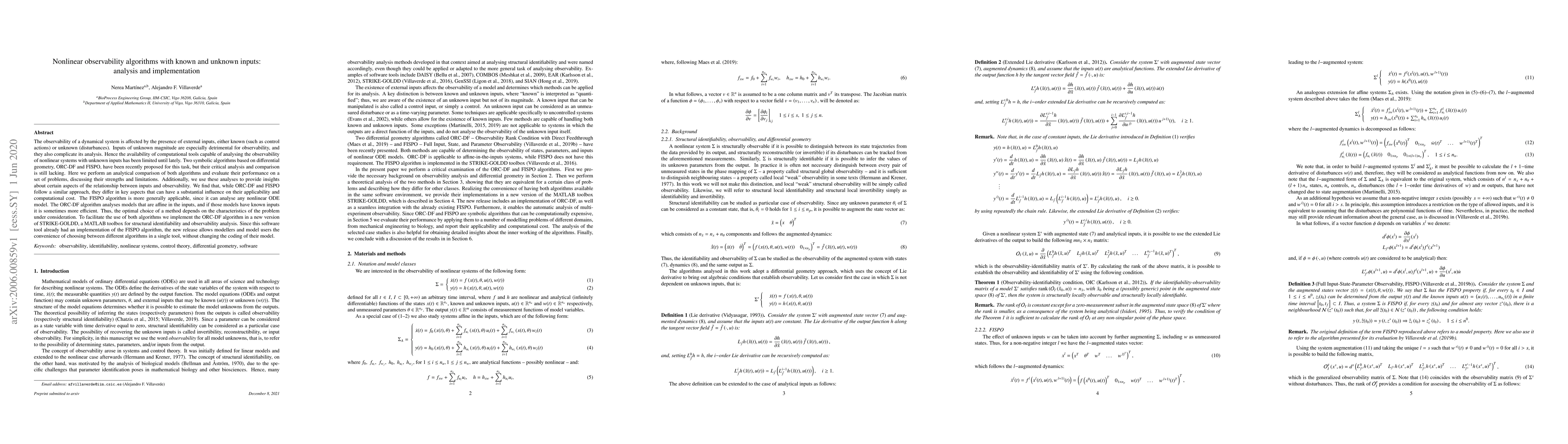 Researchers compare two nonlinear observability algorithms for systems with known and unknown inputs, finding that one is more generally applicable but the other is more efficient for specific cases.