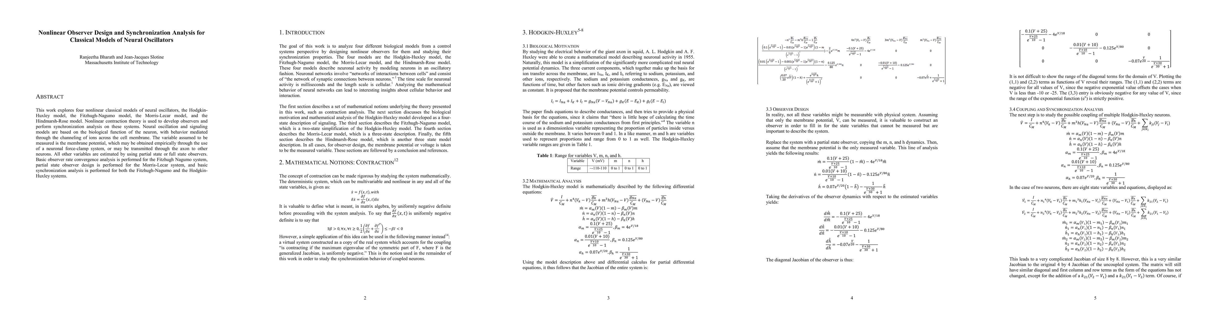 This work explores four nonlinear classical models of neural oscillators, the Hodgkin-Huxley model, the Fitzhugh-Nagumo model, the Morris-Lecar model, and the Hindmarsh-Rose model. Nonlinear contraction theory is used to develop observers and perform synchronization analysis on these systems. Neural oscillation and signaling models are based on the biological function of the neuron, with behavior mediated through the channeling of ions across the cell membrane. The variable assumed to be measured is the membrane potential, which may be obtained empirically through the use of a neuronal force-clamp system, or may be transmitted through the axon to other neurons. All other variables are estimated by using partial state or full state observers. Basic observer rate convergence analysis is performed for the Fitzhugh Nagumo system, partial state observer design is performed for the Morris-Lecar system, and basic synchronization analysis is performed for both the Fitzhugh-Nagumo and the Hodgkin-Huxley systems.