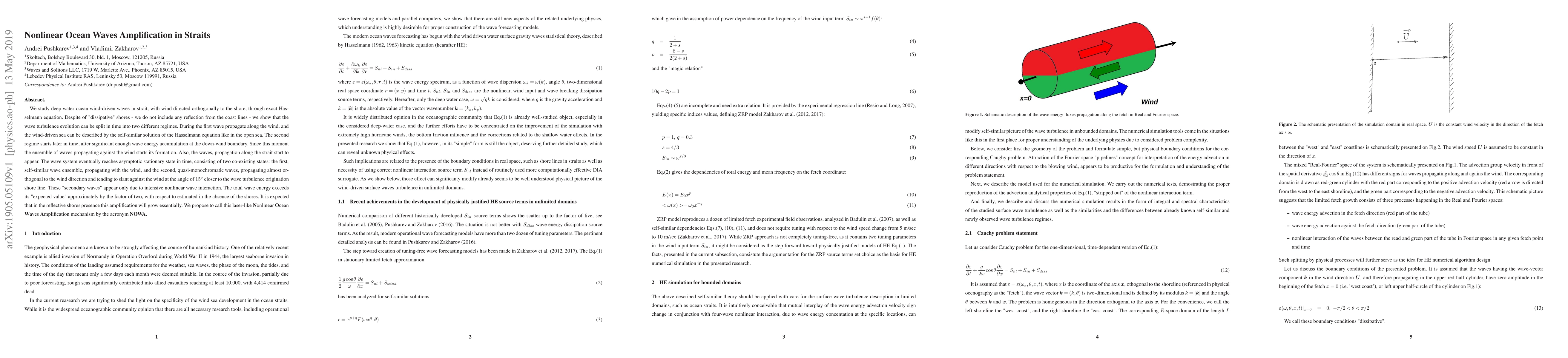 We study deep water ocean wind-driven waves in strait, with wind directed orthogonally to the shore, through exact Hasselmann equation. Despite of "dissipative" shores - we do not include any reflection from the coast lines - we show that the wave turbulence evolution can be split in time into two different regimes. During the first wave propagate along the wind, and the wind-driven sea can be described by the self-similar solution of the Hasselmann equation like in the open sea. The second regime starts later in time, after significant enough wave energy accumulation at the down-wind boundary. Since this moment the ensemble of waves propagating against the wind starts its formation. Also, the waves, propagation along the strait start to appear. The wave system eventually reaches asymptotic stationary state in time, consisting of two co-existing states: the first, self-similar wave ensemble, propagating with the wind, and the second, quasi-monochromatic waves, propagating almost orthogonal to the wind direction and tending to slant against the wind at the angle of 15 degrees closer to the wave turbulence origination shore line. These "secondary waves" appear only due to intensive nonlinear wave interaction. The total wave energy exceeds its "expected value" approximately by the factor of two, with respect to estimated in the absence of the shores. It is expected that in the reflective shores presence this amplification will grow essentially. We propose to call this laser-like Nonlinear Ocean Waves Amplification mechanism by the acronym NOWA.