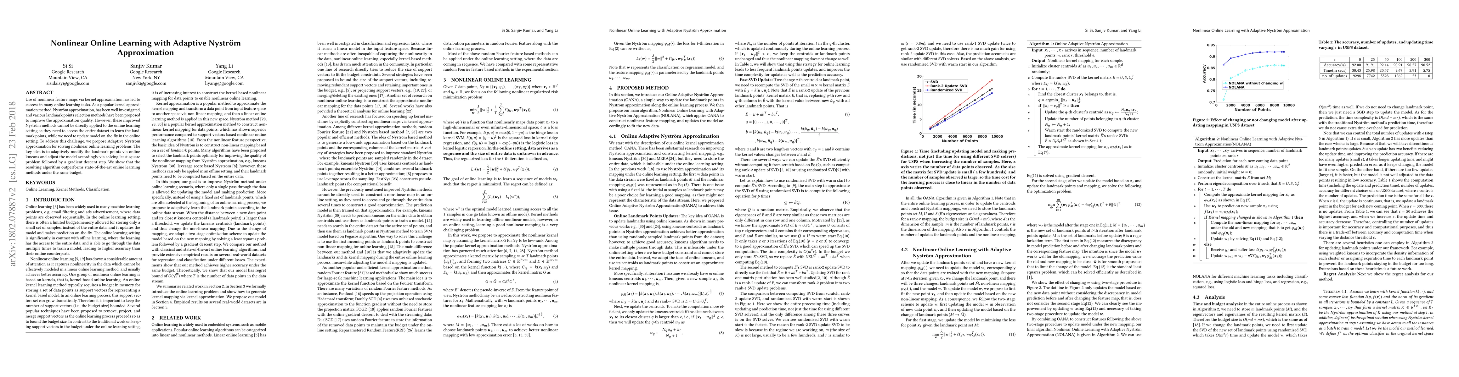 This paper proposes Adaptive Nyström approximation for nonlinear online learning, addressing the limitation of existing Nyström methods that require full dataset access. The method adaptively updates landmark points using online kmeans and adjusts the model via least squares and gradient descent, achieving superior performance compared to state-of-the-art online learning techniques.