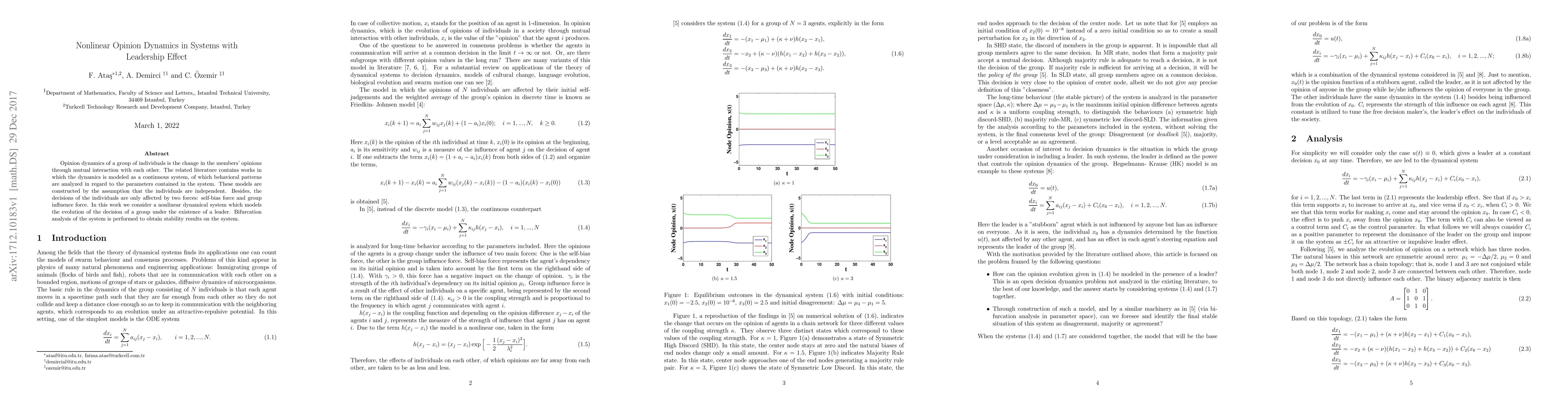 This paper models nonlinear opinion dynamics in a group with a leader, analyzing how the leader's influence affects the group's decision-making process. The study employs bifurcation analysis to determine the stability of the system under various parameters.