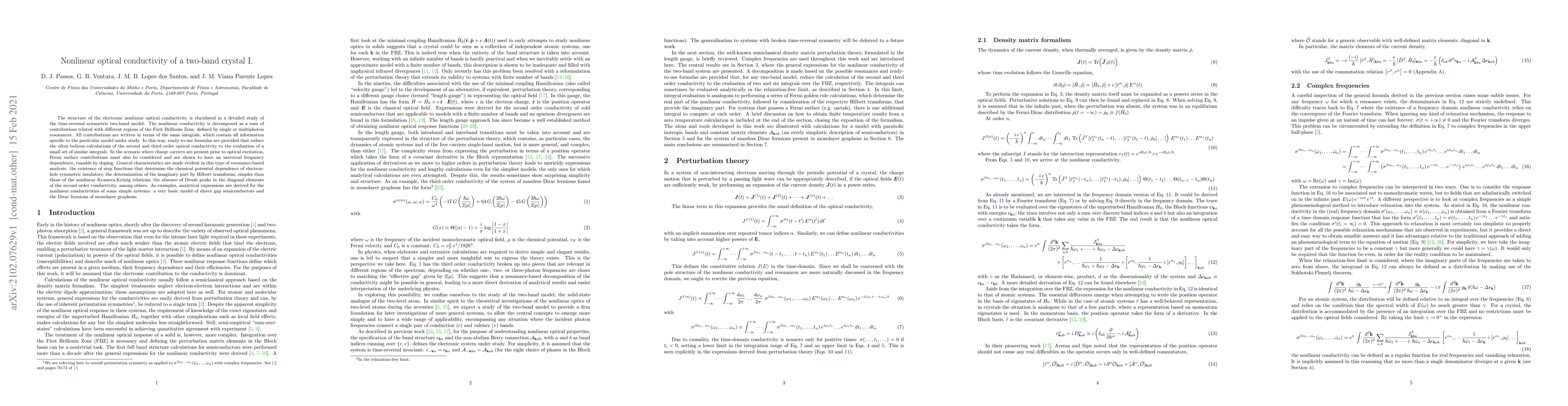 The structure of the electronic nonlinear optical conductivity is elucidated in a detailed study of the time-reversal symmetric two-band model. The nonlinear conductivity is decomposed as a sum of contributions related with different regions of the First Brillouin Zone, defined by single or multiphoton resonances. All contributions are written in terms of the same integrals, which contain all information specific to the particular model under study. In this way, ready-to-use formulas are provided that reduce the often tedious calculations of the second and third order optical conductivity to the evaluation of a small set of similar integrals. In the scenario where charge carriers are present prior to optical excitation, Fermi surface contributions must also be considered and are shown to have an universal frequency dependence, tunable by doping. General characteristics are made evident in this type of resonance-based analysis: the existence of step functions that determine the chemical potential dependence of electron-hole symmetric insulators; the determination of the imaginary part by Hilbert transforms, simpler than those of the nonlinear Kramers-Kr\"{o}nig relations; the absence of Drude peaks in the diagonal elements of the second order conductivity, among others. As examples, analytical expressions are derived for the nonlinear conductivities of some simple systems: a very basic model of direct gap semiconductors and the Dirac fermions of monolayer graphene.