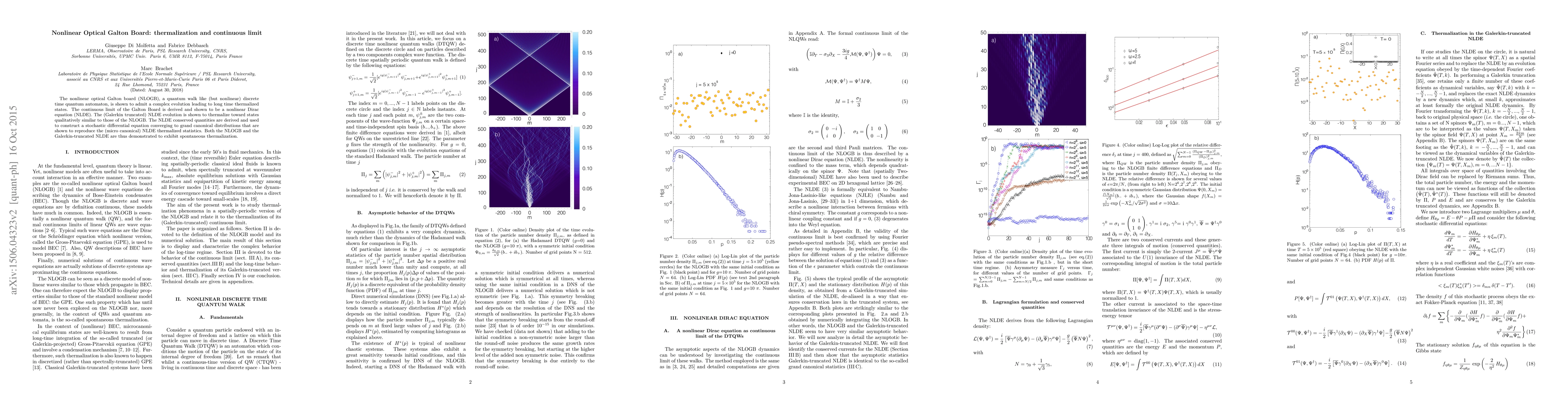 The nonlinear optical Galton board (NLOGB), a quantum walk like (but nonlinear) discrete time quantum automaton, is shown to admit a complex evolution leading to long time thermalized states. The continuous limit of the Galton Board is derived and shown to be a nonlinear Dirac equation (NLDE). The (Galerkin truncated) NLDE evolution is shown to thermalize toward states qualitatively similar to those of the NLOGB. The NLDE conserved quantities are derived and used to construct a stochastic differential equation converging to grand canonical distributions that are shown to reproduce the (micro canonical) NLDE thermalized statistics. Both the NLOGB and the Galerkin-truncated NLDE are thus demonstrated to exhibit spontaneous thermalization.