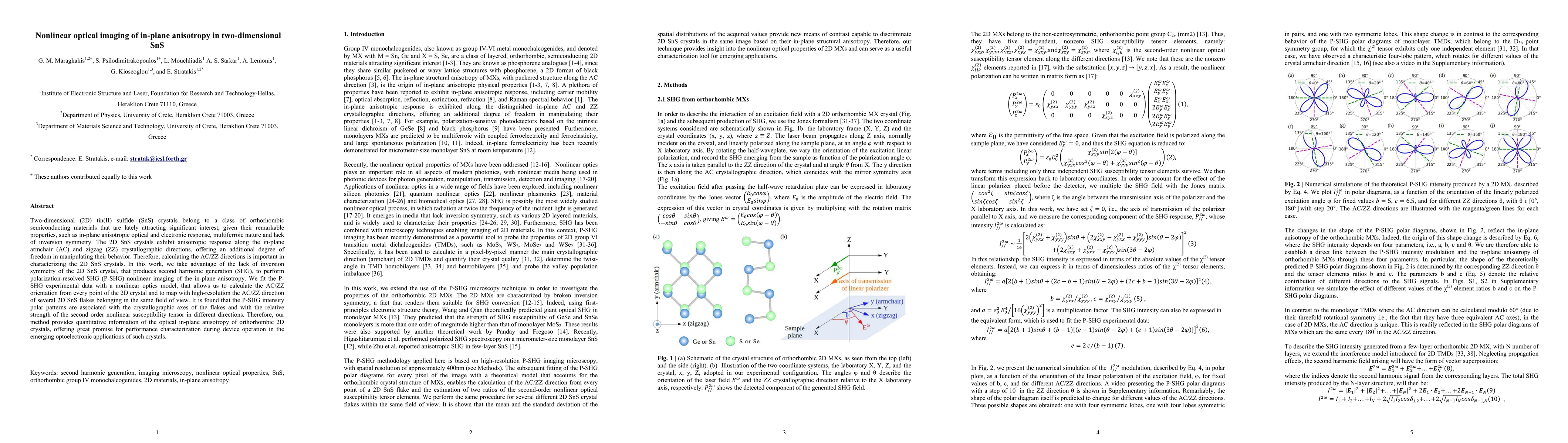 This paper utilizes polarization-resolved second harmonic generation (P-SHG) nonlinear imaging to characterize the in-plane anisotropy of two-dimensional SnS crystals. The study maps the anisotropic response along the armchair and zigzag directions, providing high-resolution information on the crystallographic axes and the relative strength of the nonlinear susceptibility tensor.