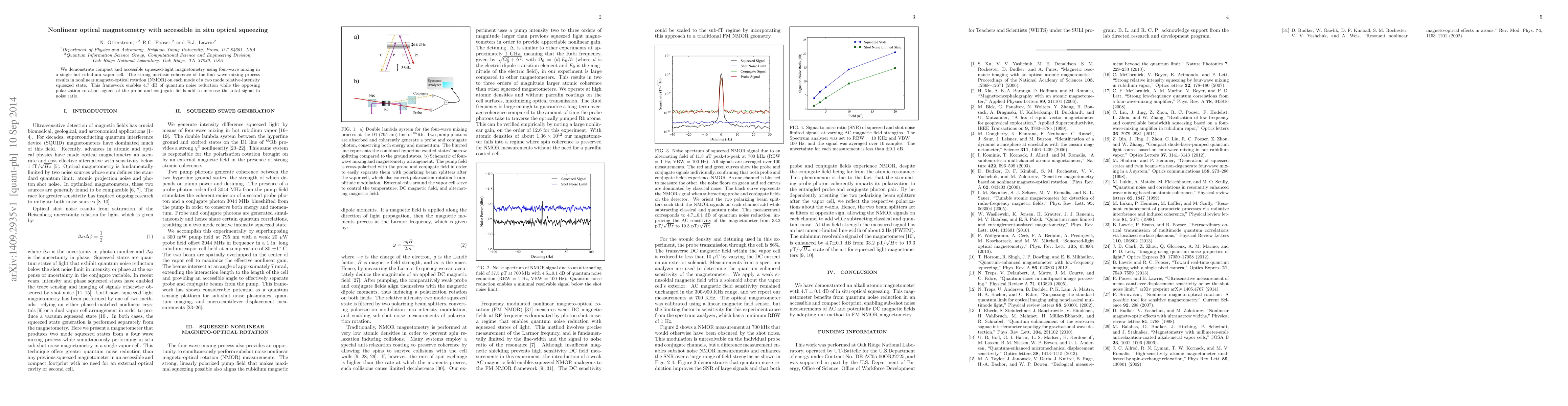 We demonstrate compact and accessible squeezed-light magnetometry using four-wave mixing in a single hot rubidium vapor cell. The strong intrinsic coherence of the four wave mixing process results in nonlinear magneto-optical rotation (NMOR) on each mode of a two mode relative-intensity squeezed state. This framework enables 4.7 dB of quantum noise reduction while the opposing polarization rotation signals of the probe and conjugate fields add to increase the total signal to noise ratio.