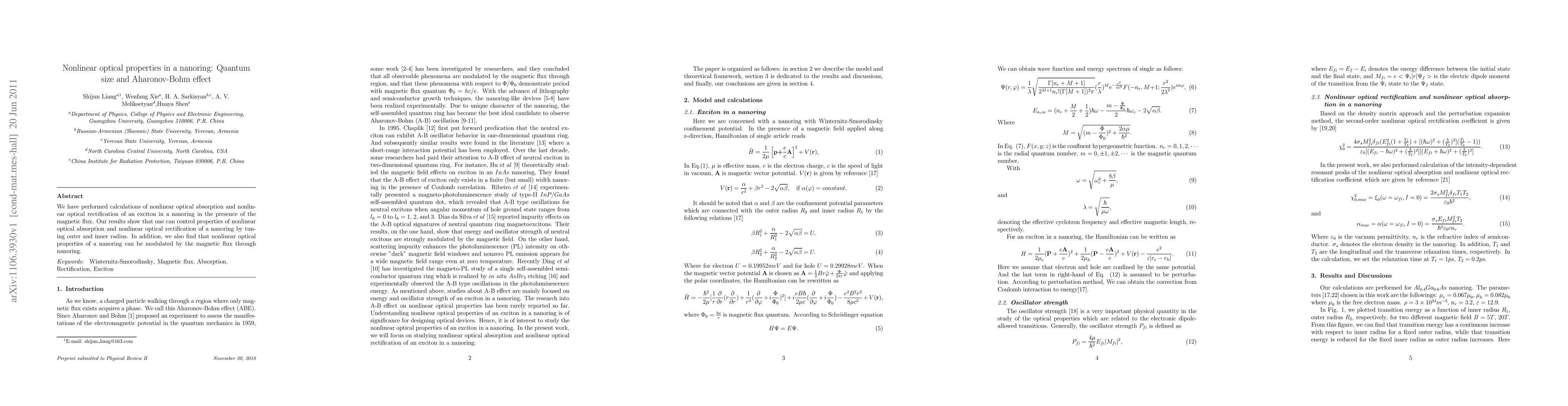 We have performed calculations of nonlinear optical absorption and nonlinear optical rectification of an exciton in a nanoring in the presence of the magnetic flux. Our results show that one can control properties of nonlinear optical absorption and nonlinear optical rectification of a nanoring by tuning outer and inner radius. In addition, we also find that nonlinear optical properties of a nanoring can be modulated by the magnetic flux through nanoring.